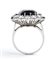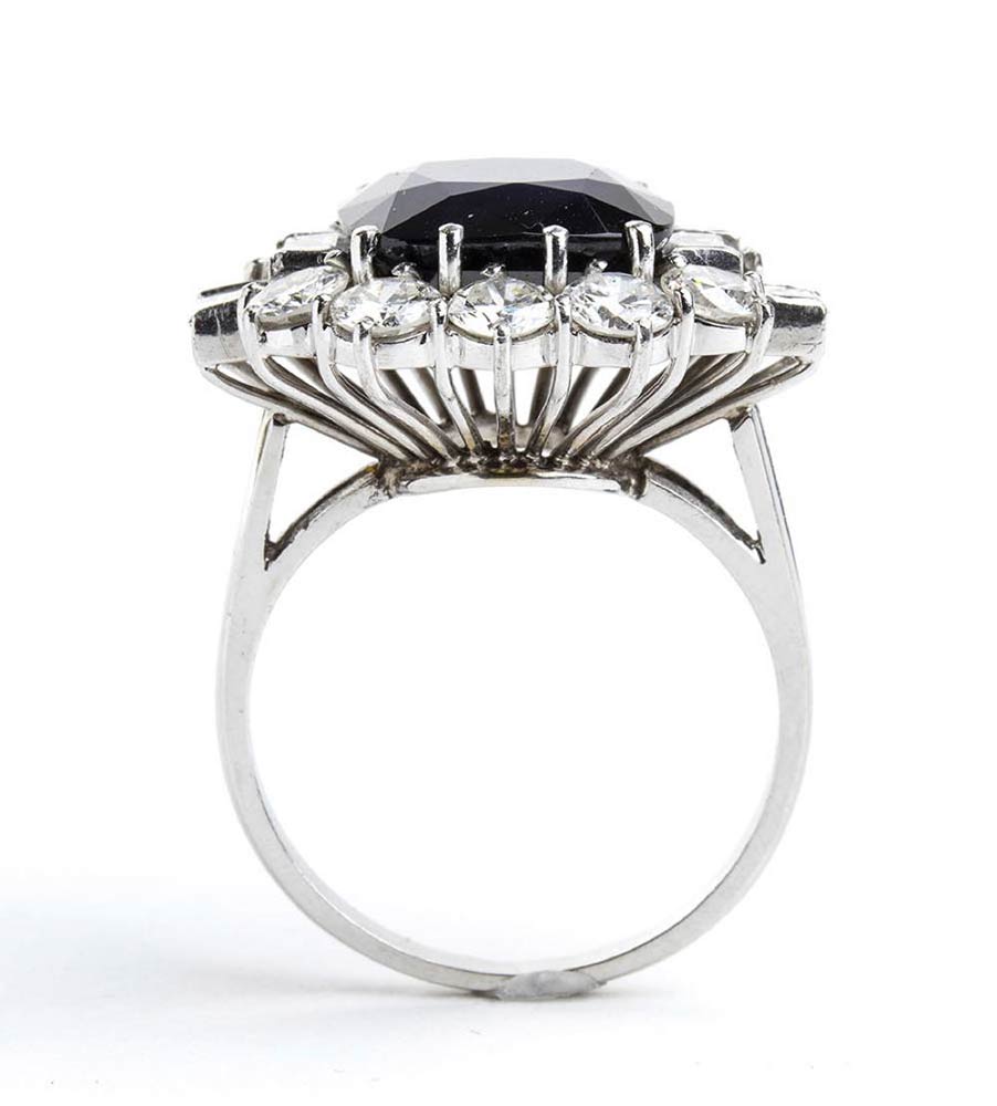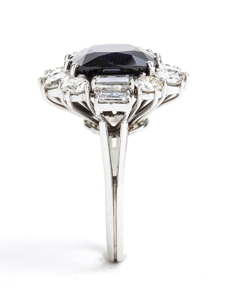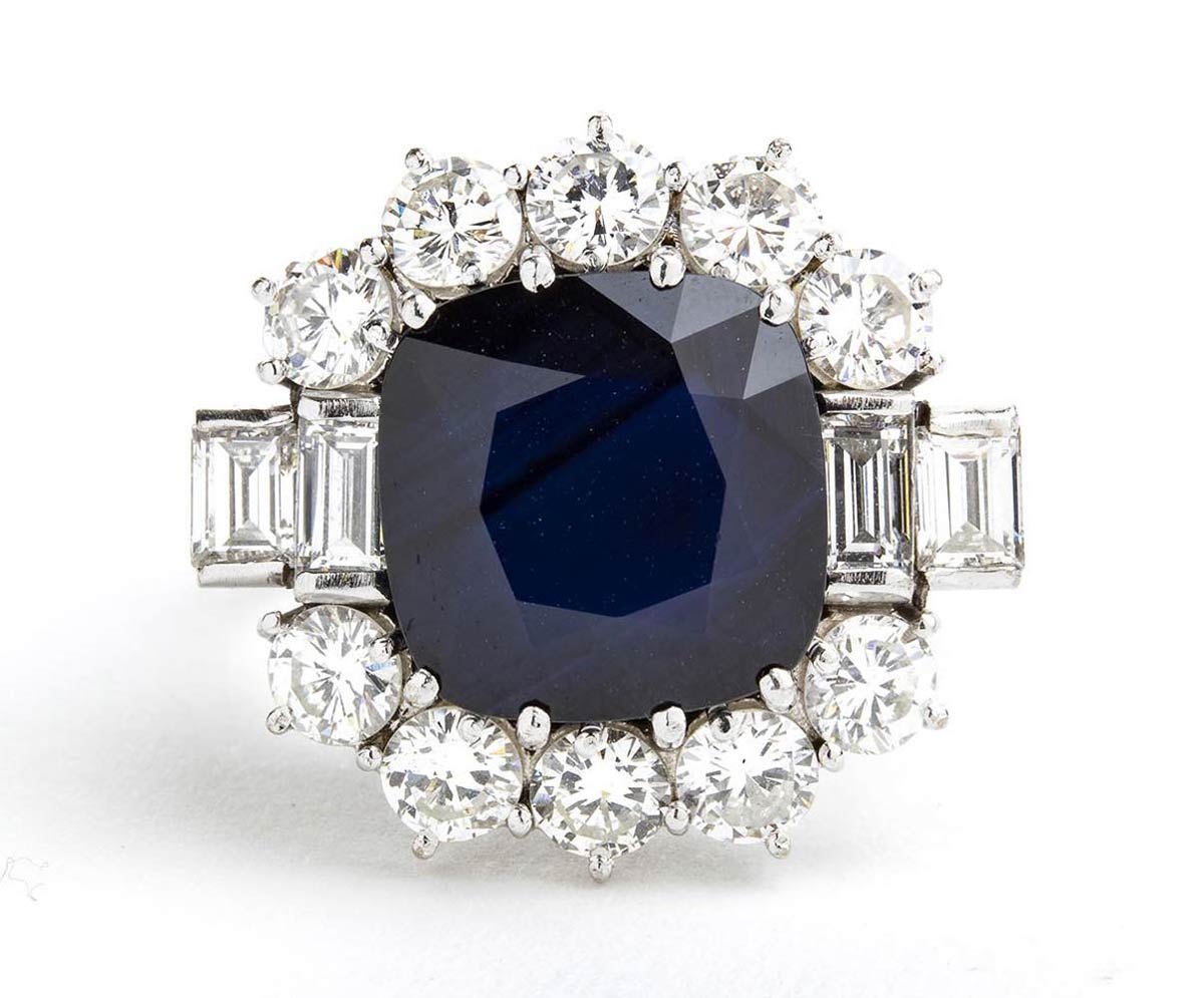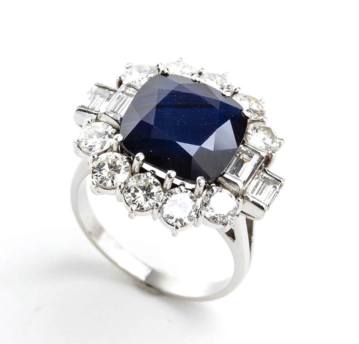 oro bianco 18k, incastonato con zaffiro taglio a cuscino 5,00 ct circa contornato da diamanti taglio baguette e rotondi taglio brillante 2,60 ct circa, E-F, VVS-SI.