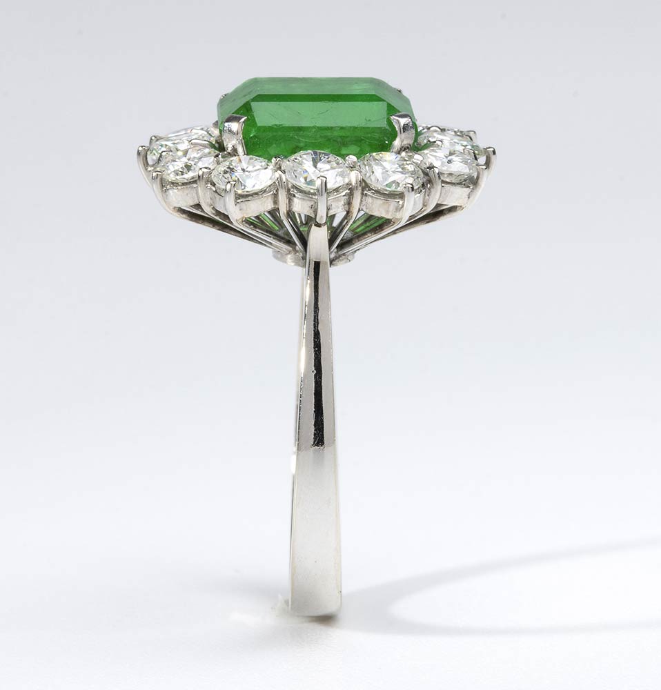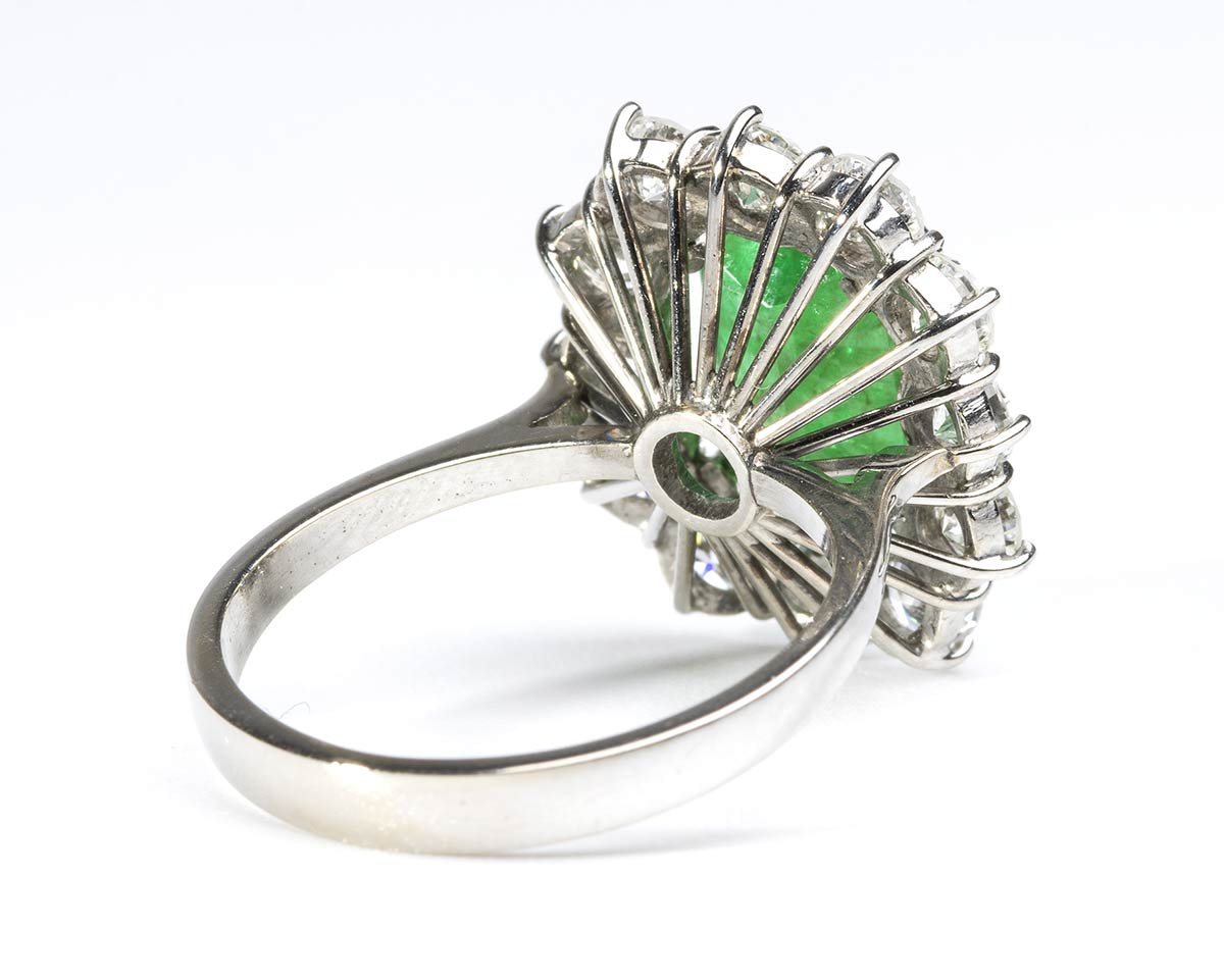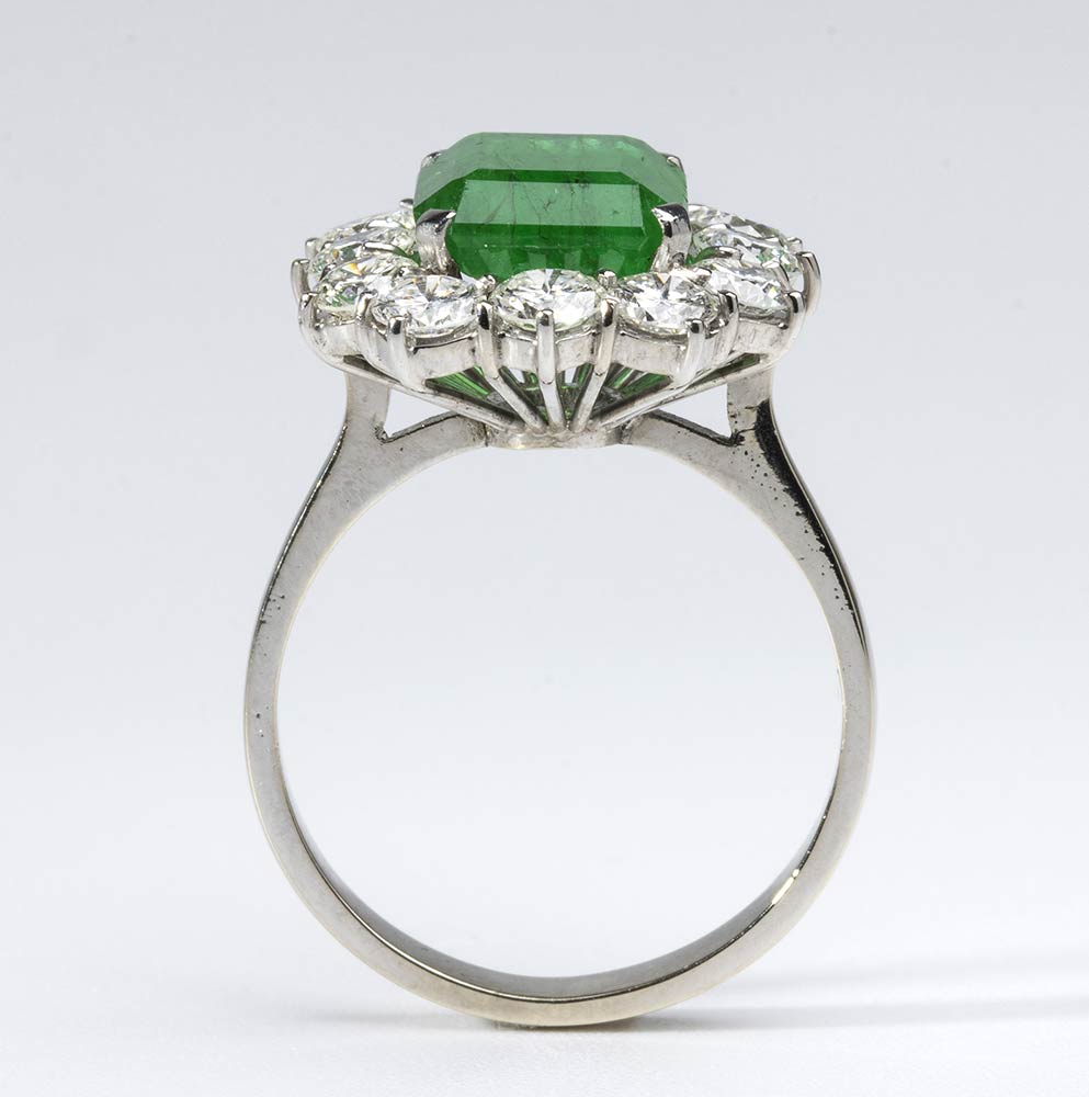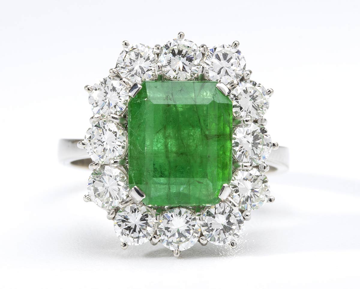 oro bianco 18k, incastonato con smeraldo incorniciato da diamanti.