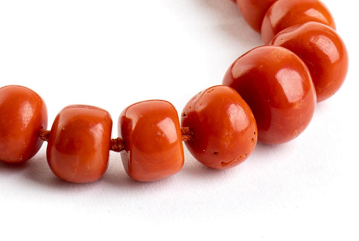 oro giallo 18k, un filo di barilotti di corallo Mediterraneo (corallium rubrum) disposti in gradazione.