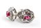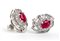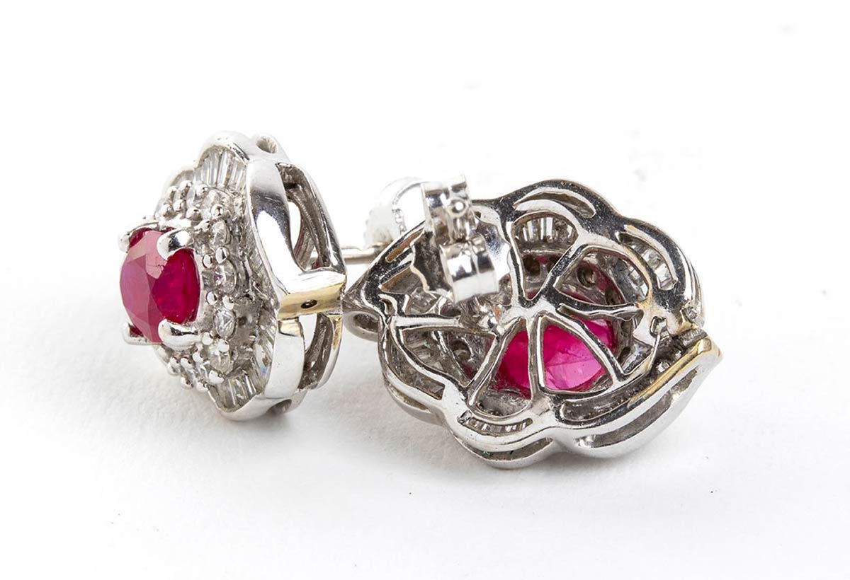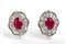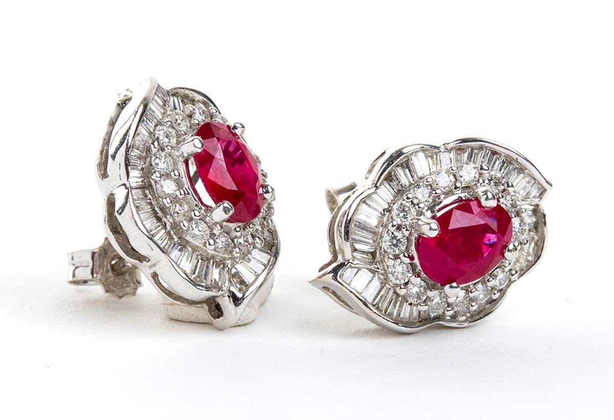 oro bianco 18k, ciascuno incastonato con rubino ovale circa 2,10 ct totali, incorniciati da diamanti taglio tapered e rotondi taglio brillante 2,35 ct circa, F-G, VS-SI. Punzonati "750".