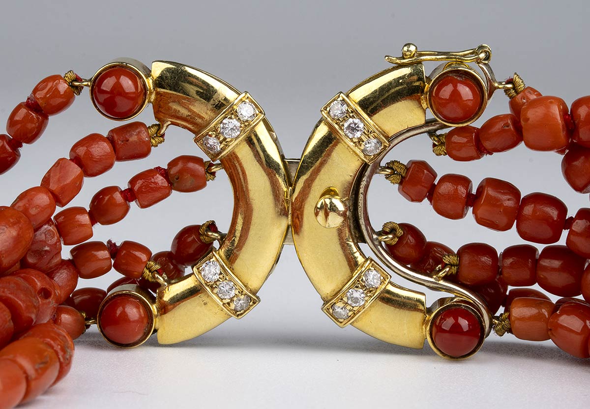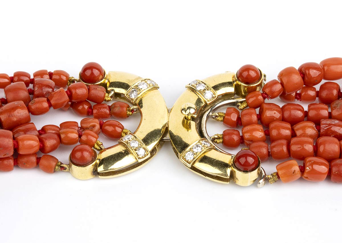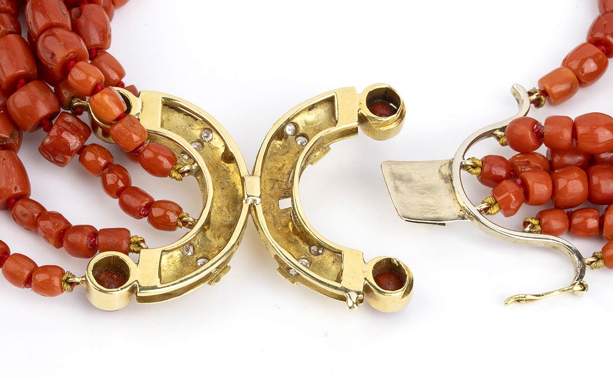 oro giallo 18k, sei fili di barilotti di corallo mediterraneo (corallium rubrum) disposti in gradazione.