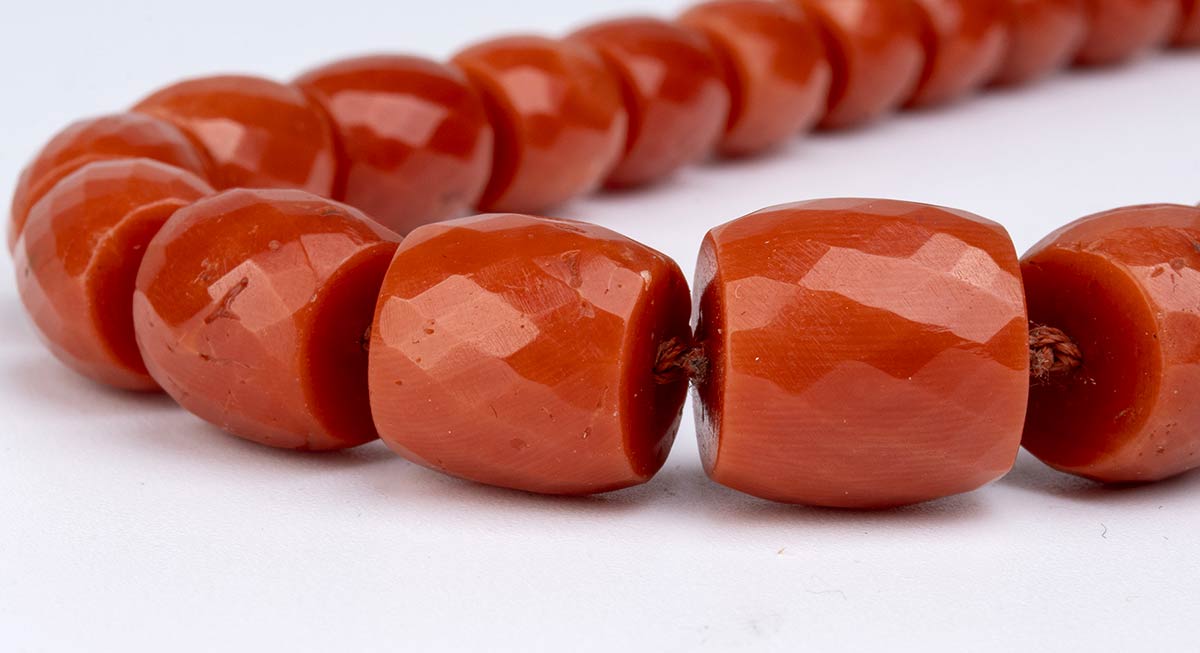 oro giallo 18k, ad un filo di barilotti sfaccettati di corallo Mediterraneo (corallium rubrum) disposti in gradazione.