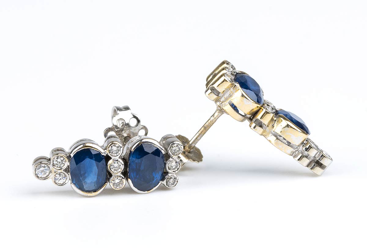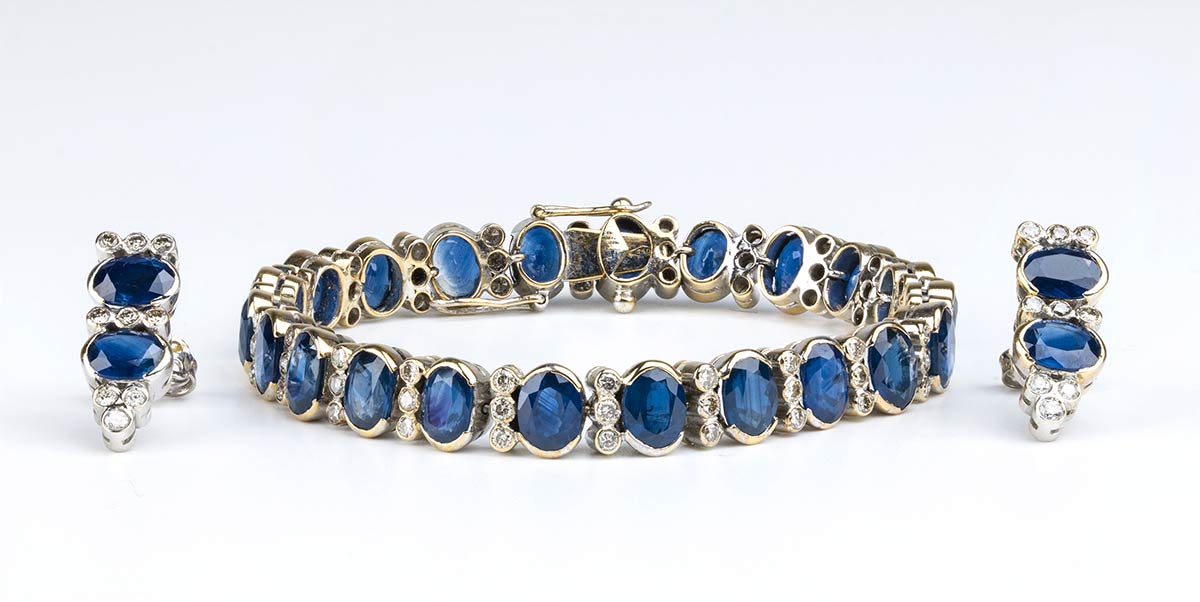 Bracciale e paio di orecchi in oro bianco con linea di zaffiri e diamanti