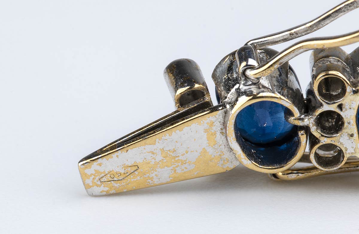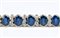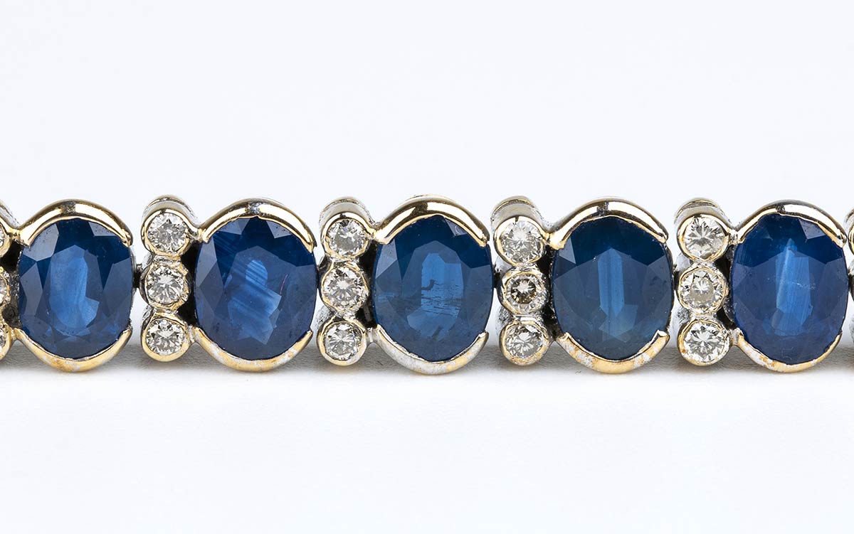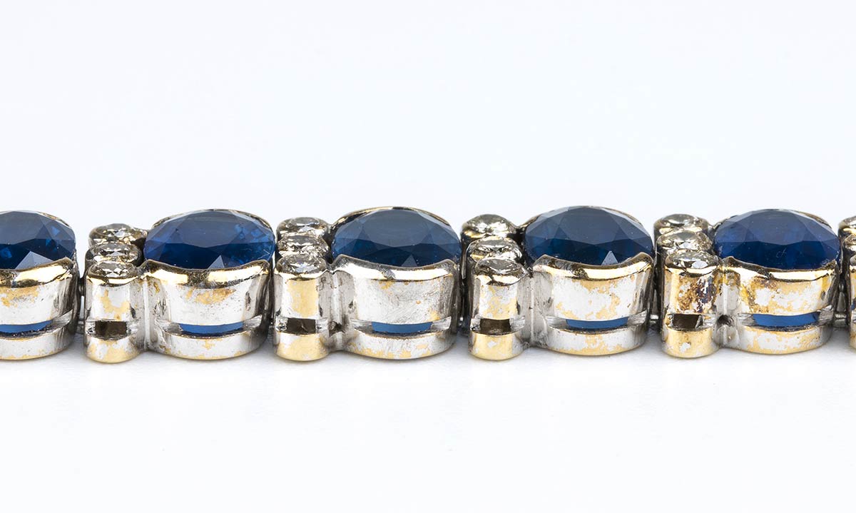 oro bianco 18k, con linea di zaffiri separati da coppie di diamanti.