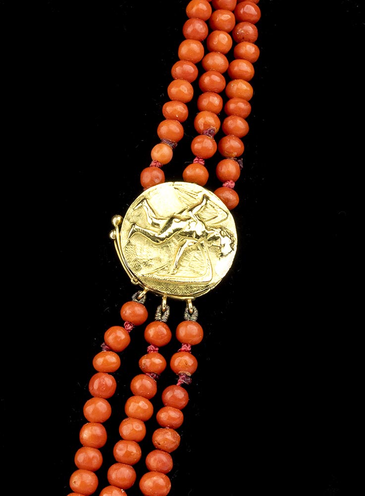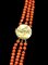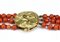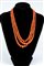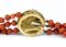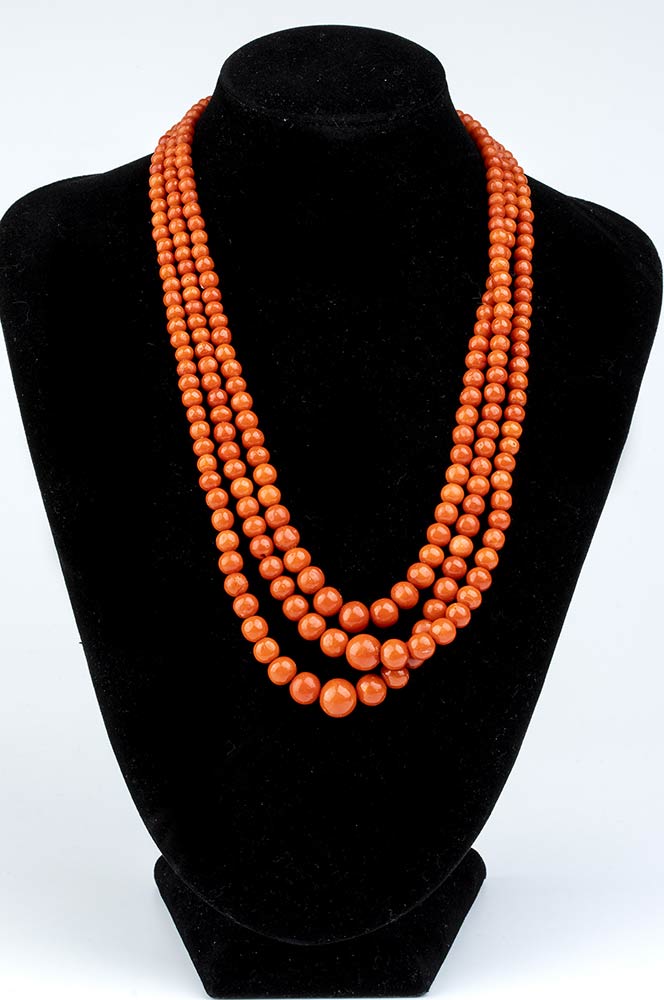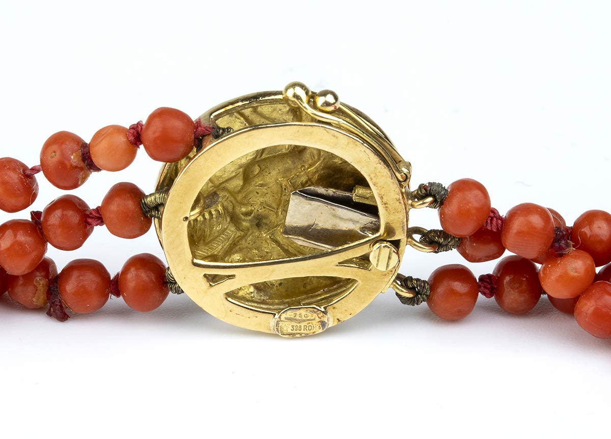 oro giallo 18k, a tre fili di sfere di corallo Mediterraneo (corallium rubrum) disposte in gradazione. Punzonato "750 - 398 ROMA".