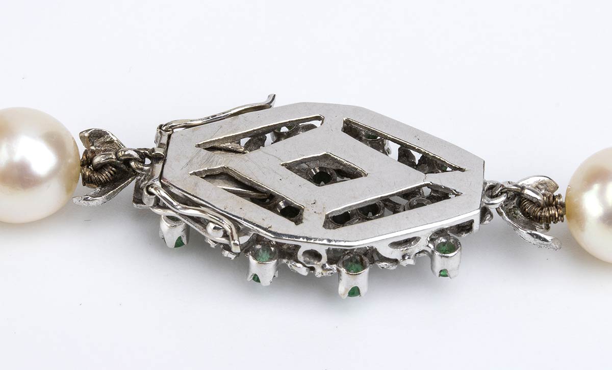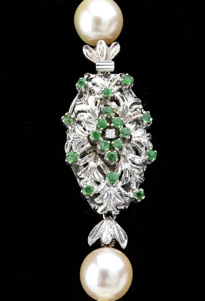 oro bianco 18k, ad un filo di perle coltivate d'acqua salata; fermezza in oro incastonata con smeraldi.