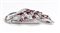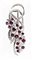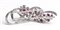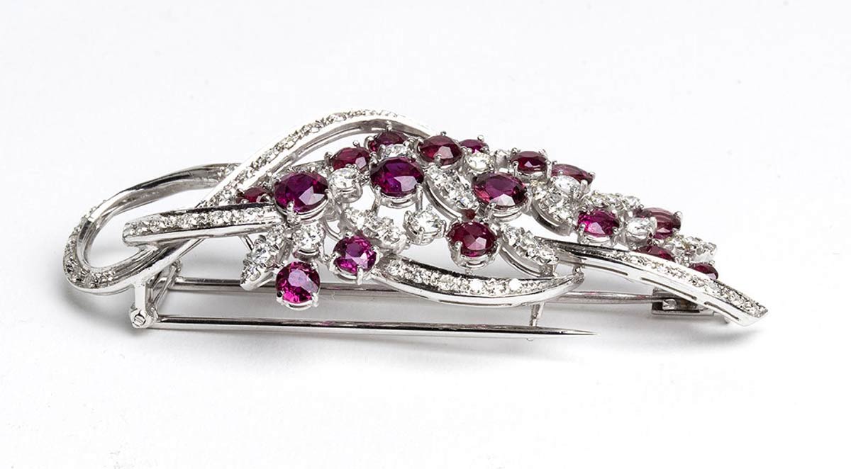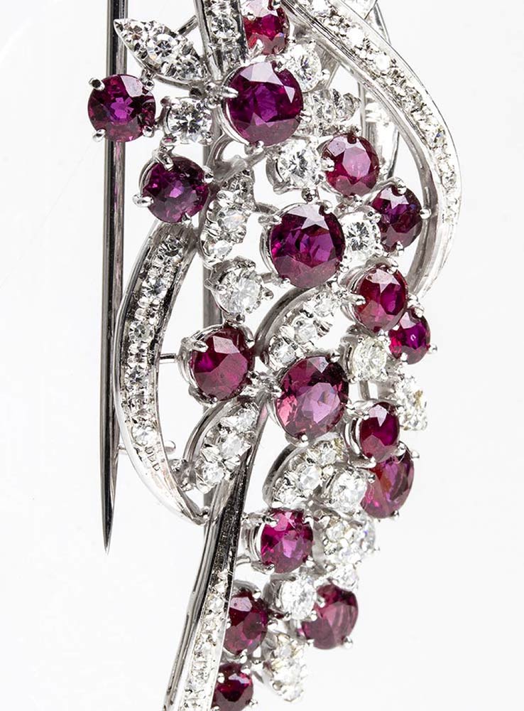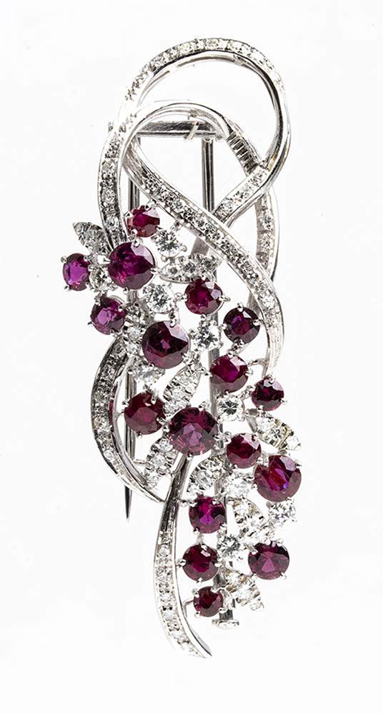 oro bianco 18k, motivo di nastri, punteggiature e foglioline in diamanti rotondi taglio brillante 1,60 ct circa, F-G, VS-SI, altre punteggiature in rubini rotondi 2,30 ct circa. Punzonata "18k".