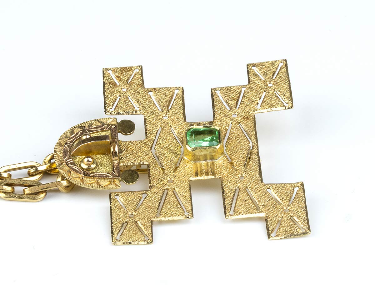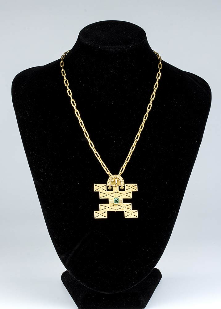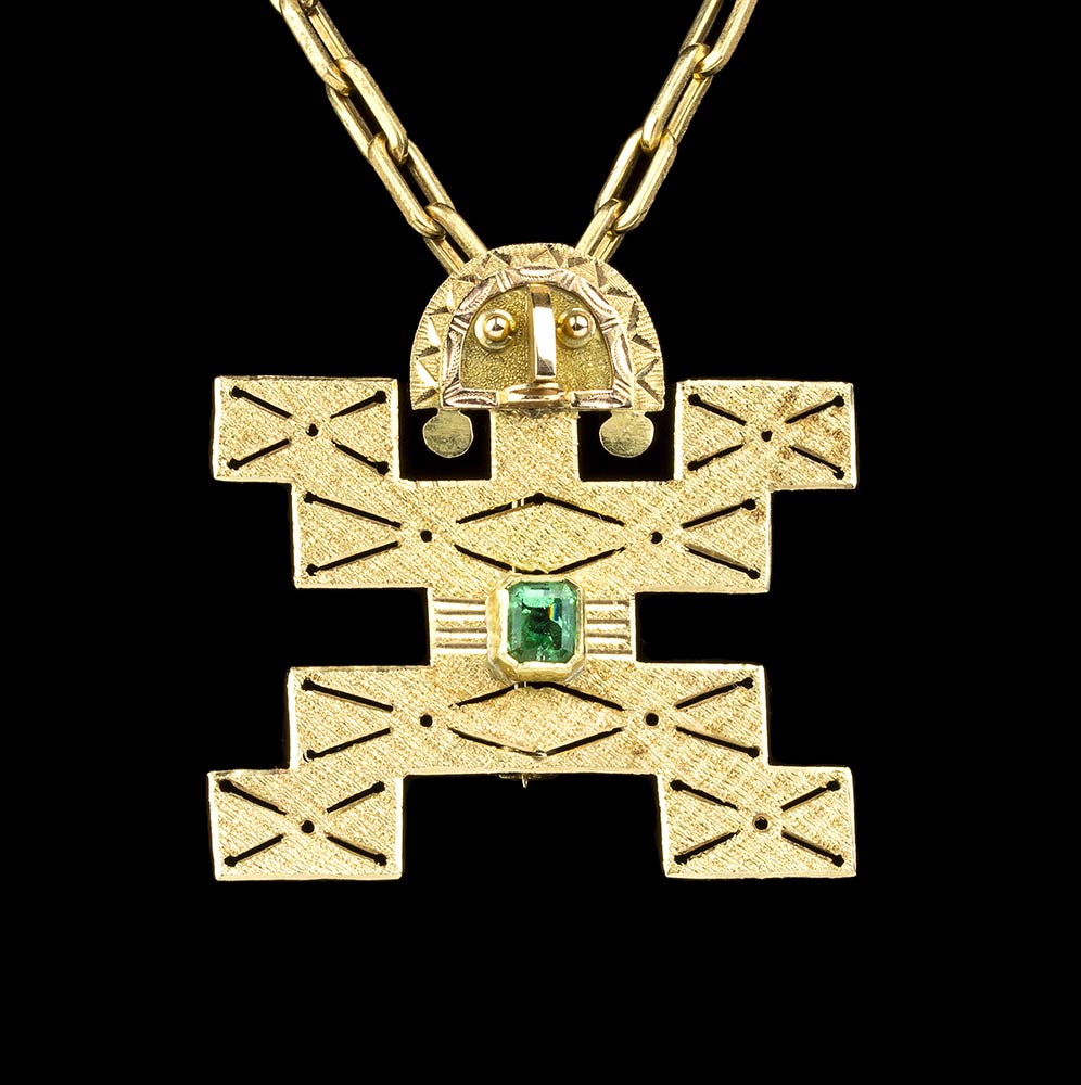 oro giallo 18k, pendente con figura di ispirazione precolombiana incastonato con smeraldo.