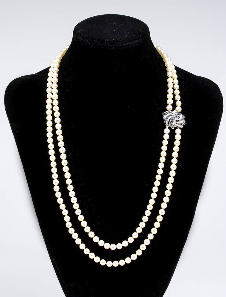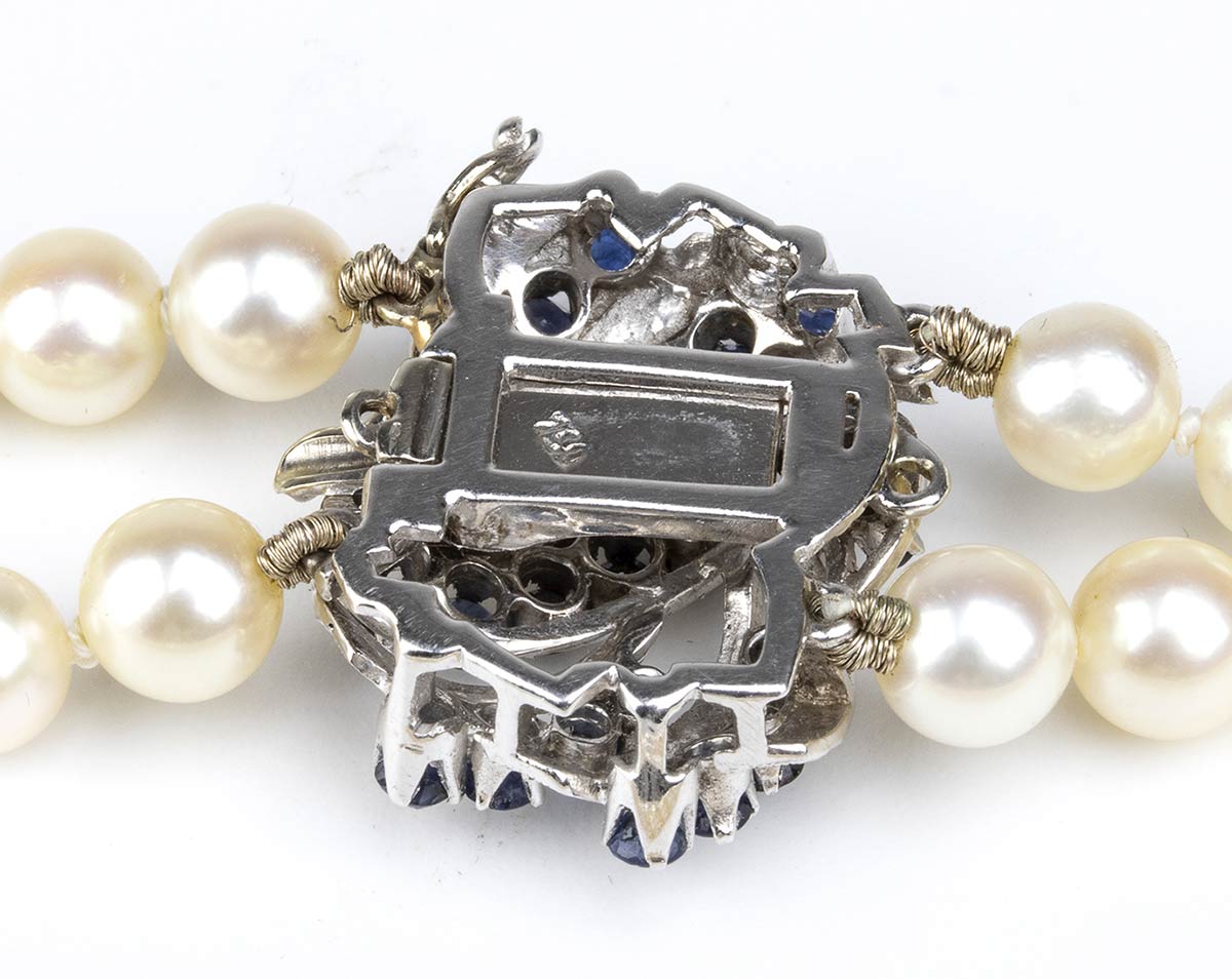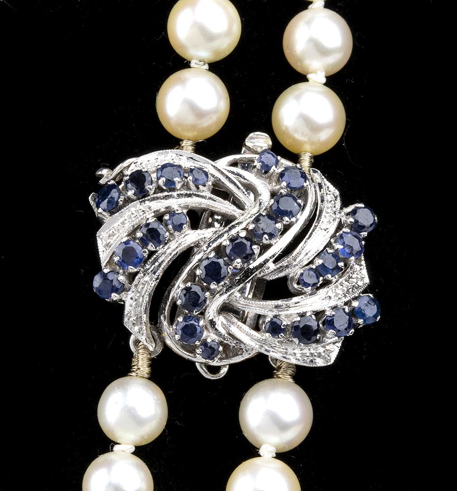 a due fili di perle coltivate d'acqua salata con fermezza a motivo di girali in oro bianco 18k e zaffiri.