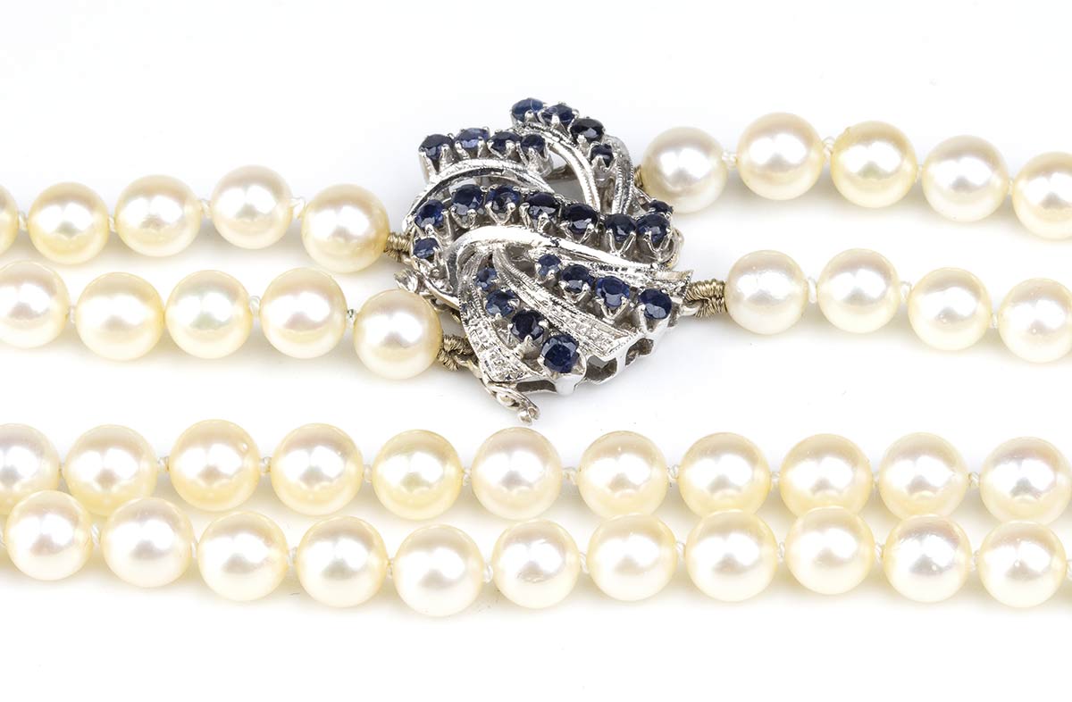 Lot 461 | Collana di perle con fermezza in oro bianco zaffiri e diamanti