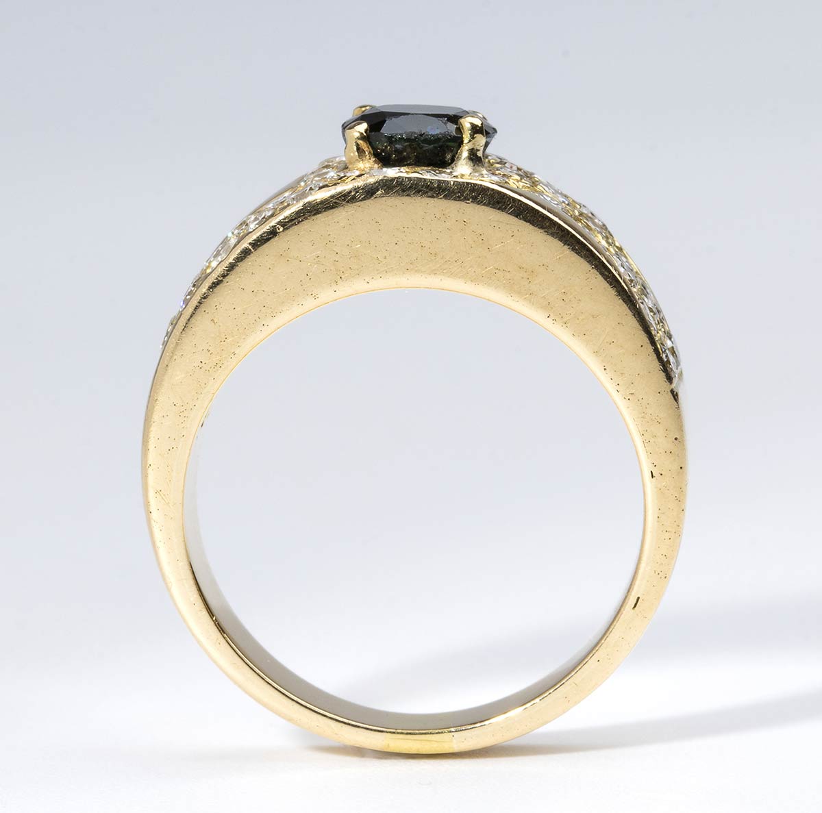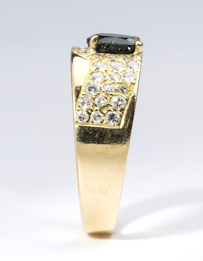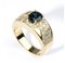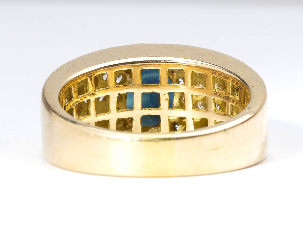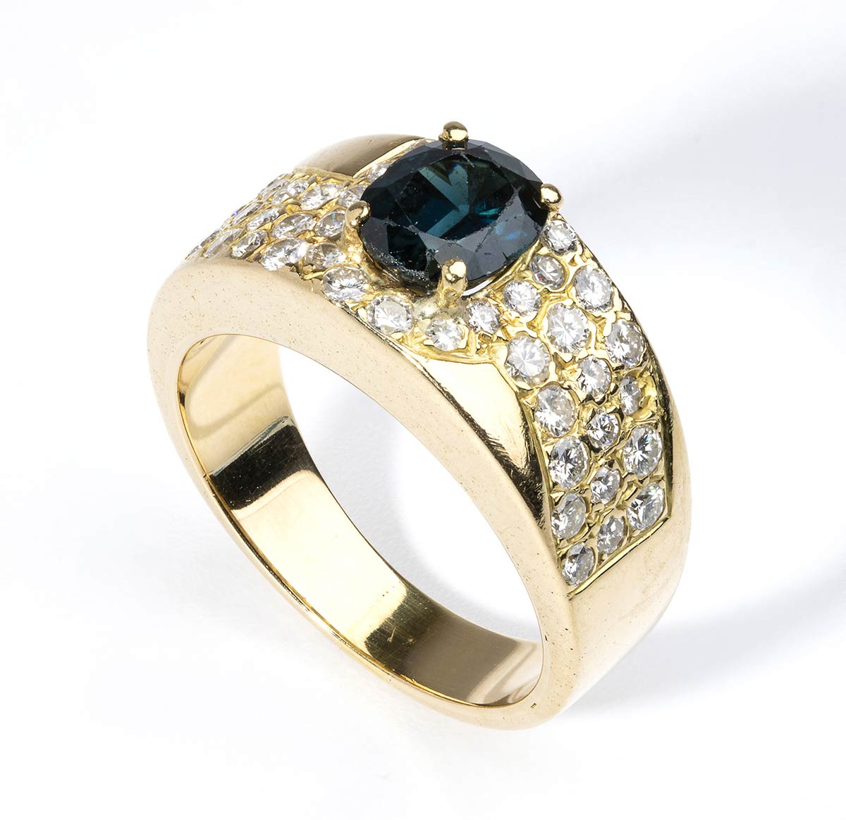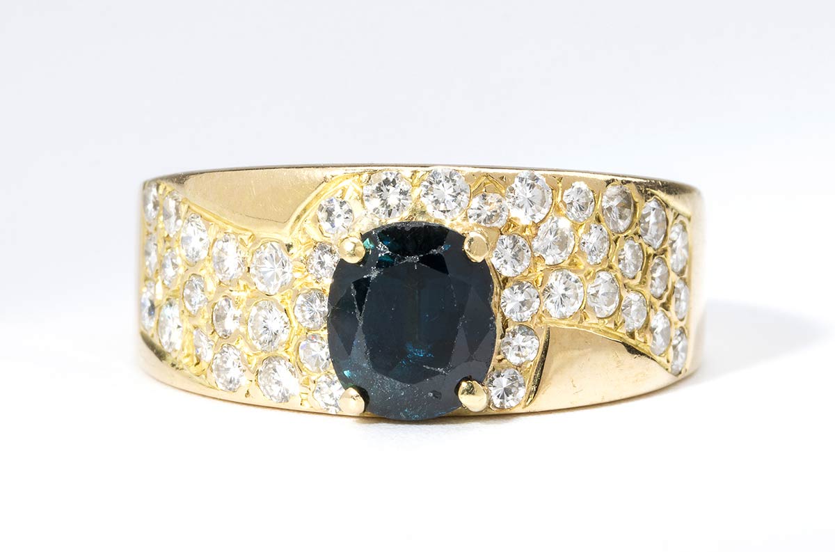 oro giallo 18k, modellato come una fascia, incastonato con zaffiro ovale affiancato da pavé di diamanti.