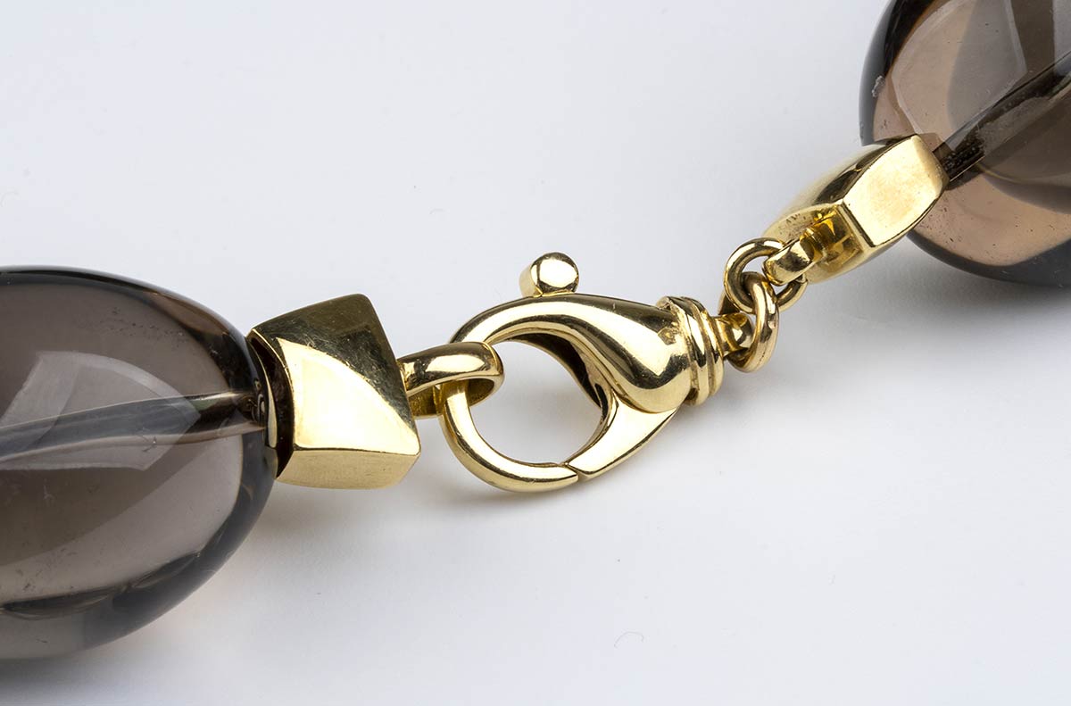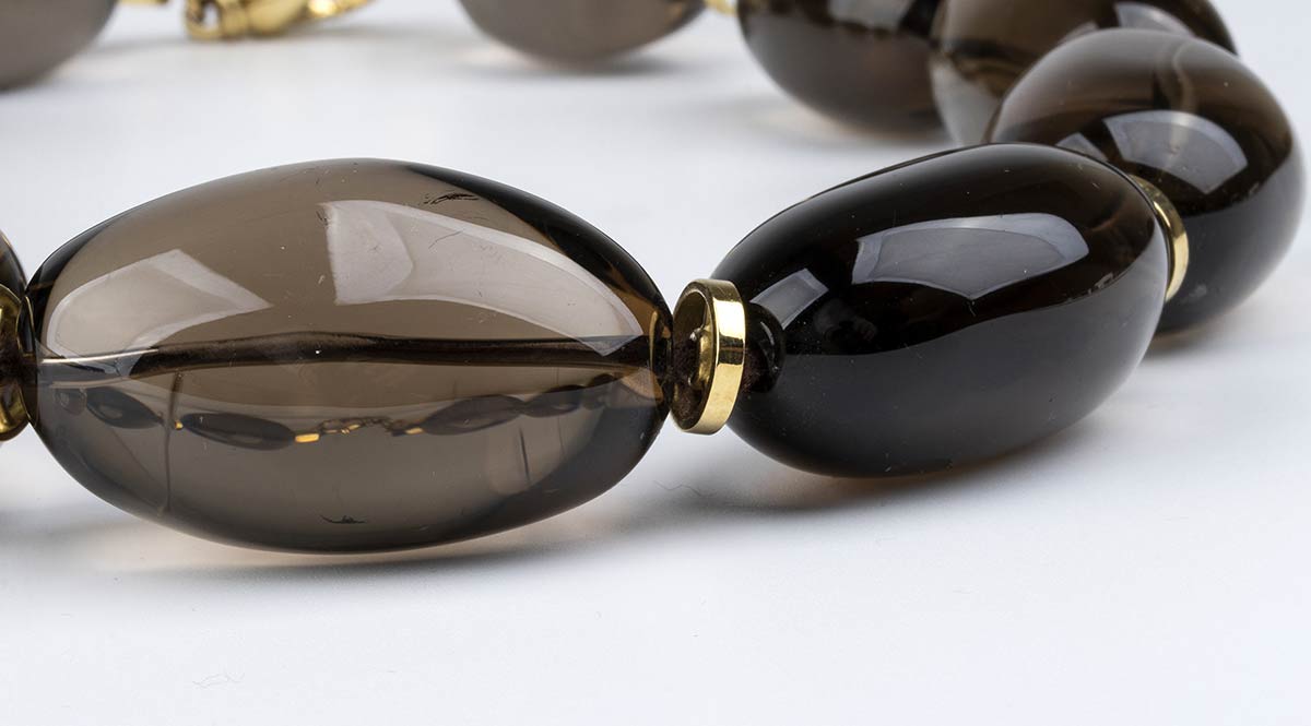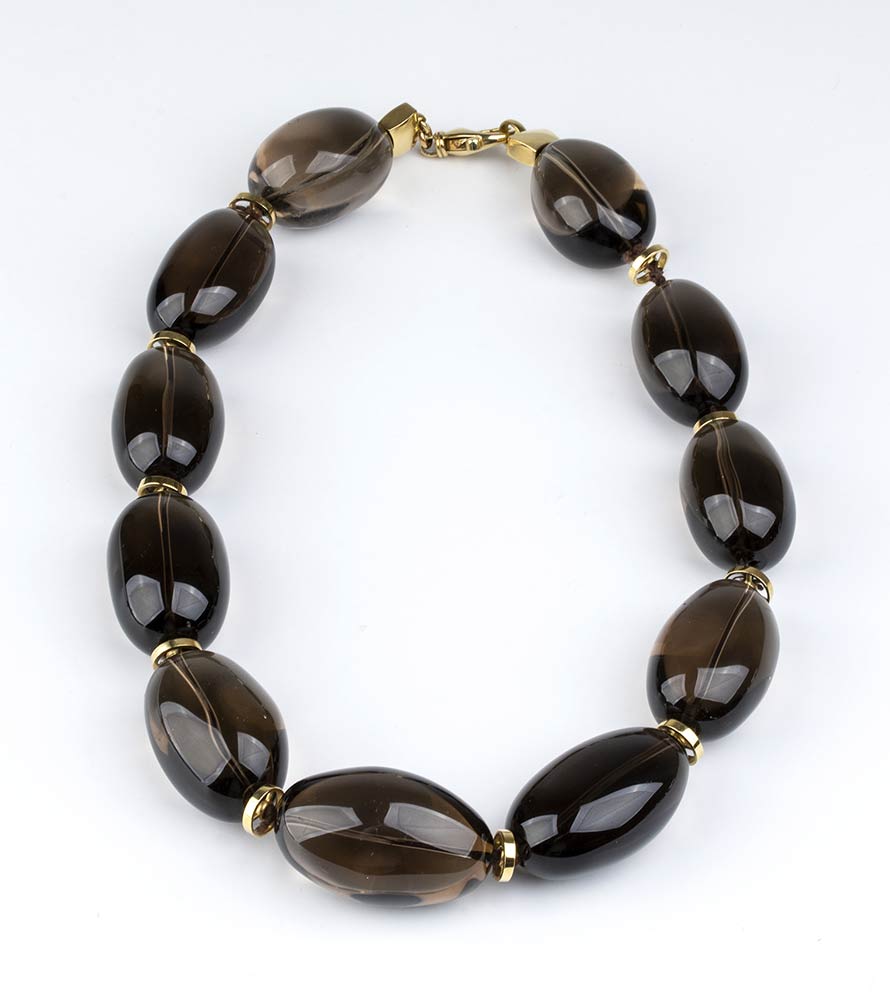 oro giallo 18k, un filo di elementi ad ovetto in quarzo fumé separati da piccoli anelli in oro.