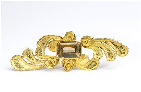 oro giallo 18k, a motivo di piccoli fiori e volute vegetali, incastonata con quarzo citrino.