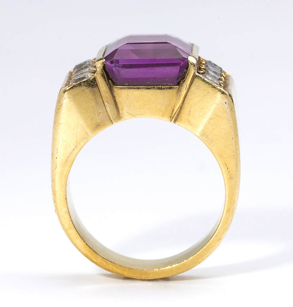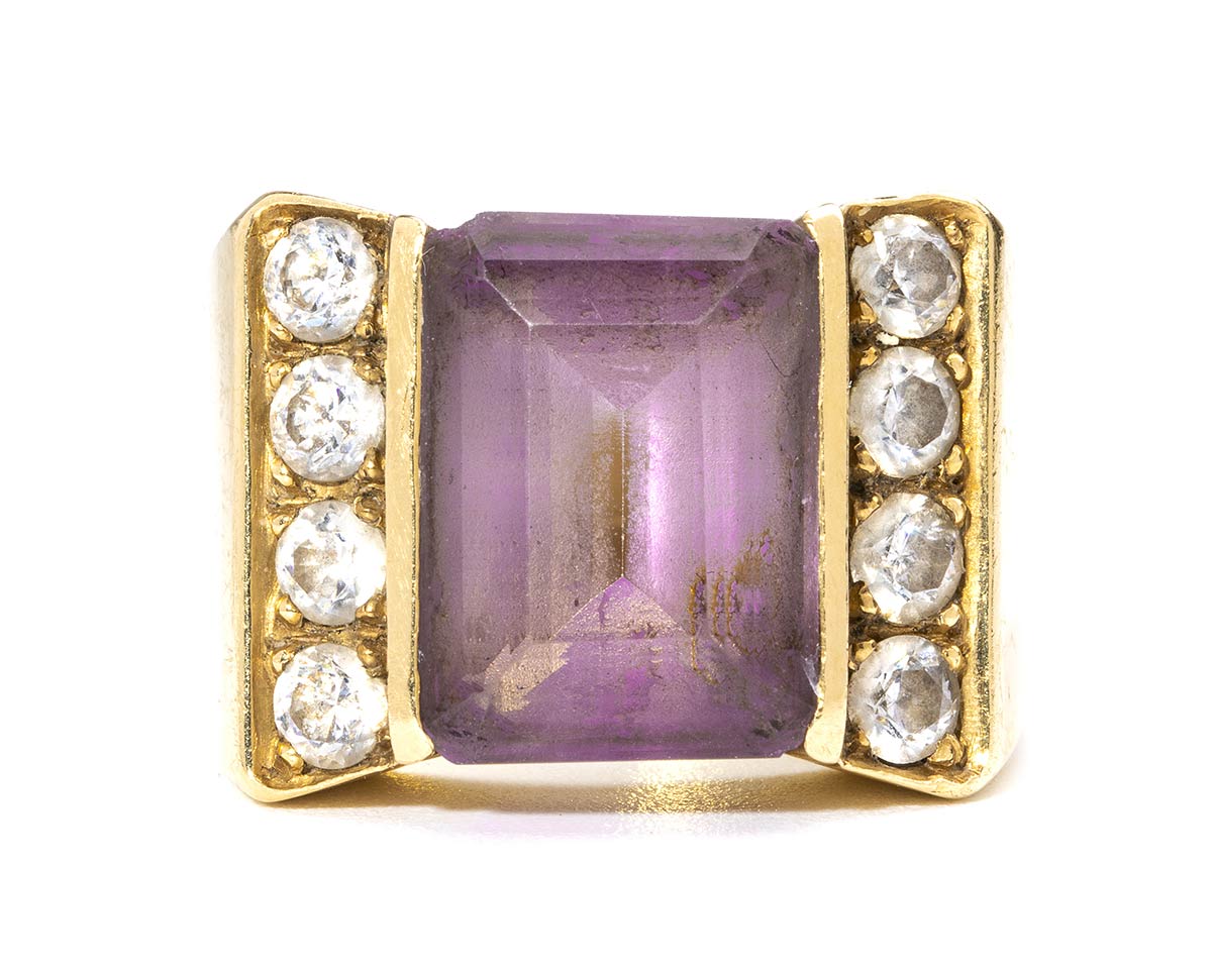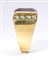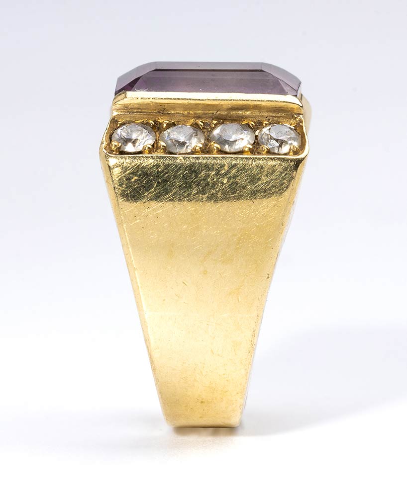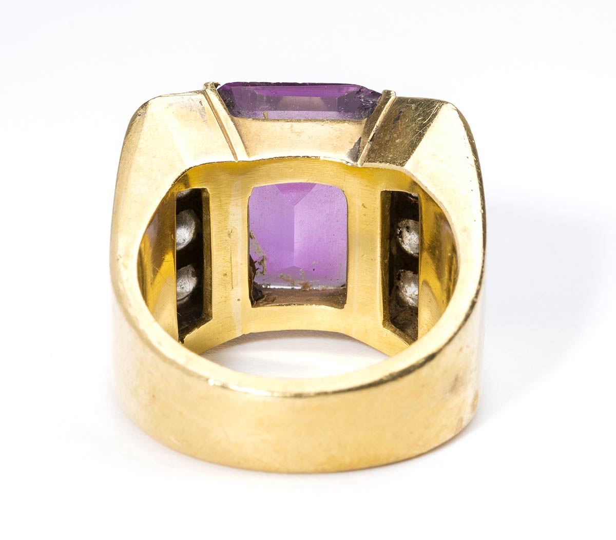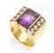 oro giallo 18k, incastonato con paste vitree viola ed incolori.