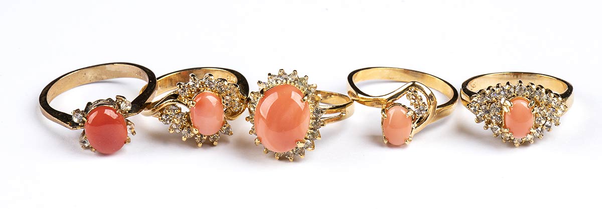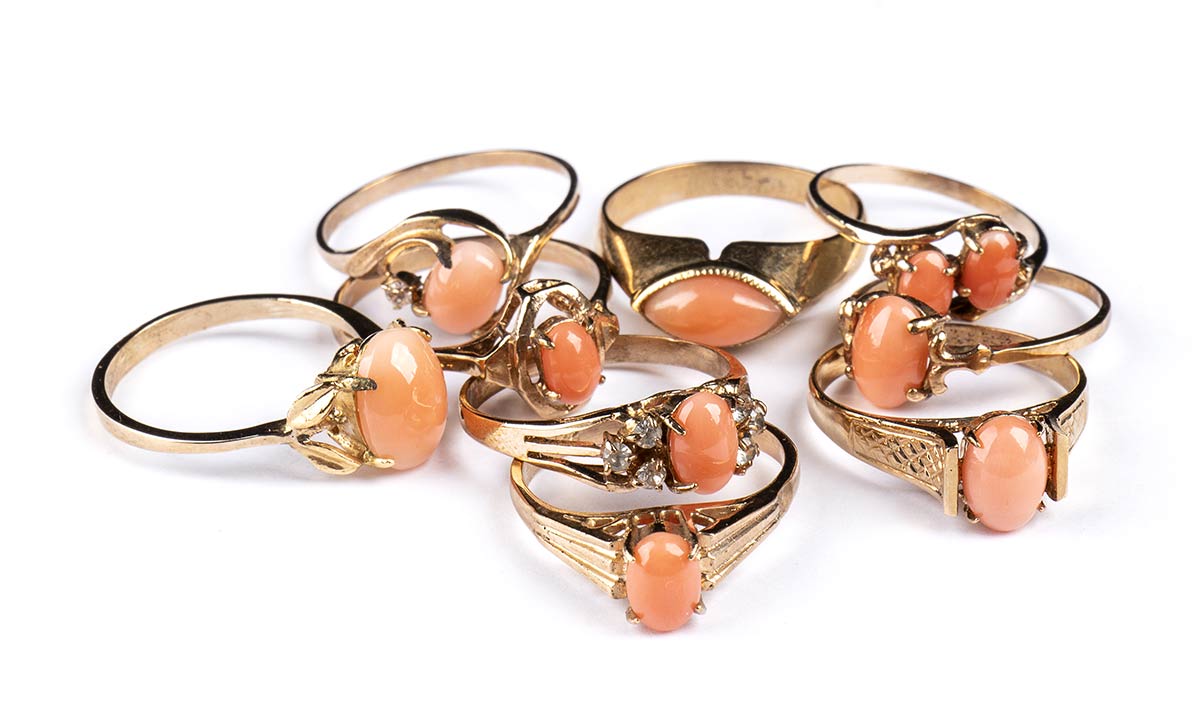 14 anelli in oro, argento e corallo cerasuolo
