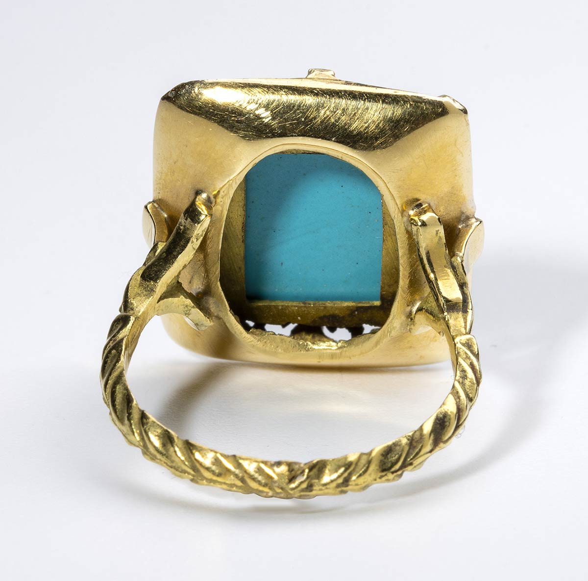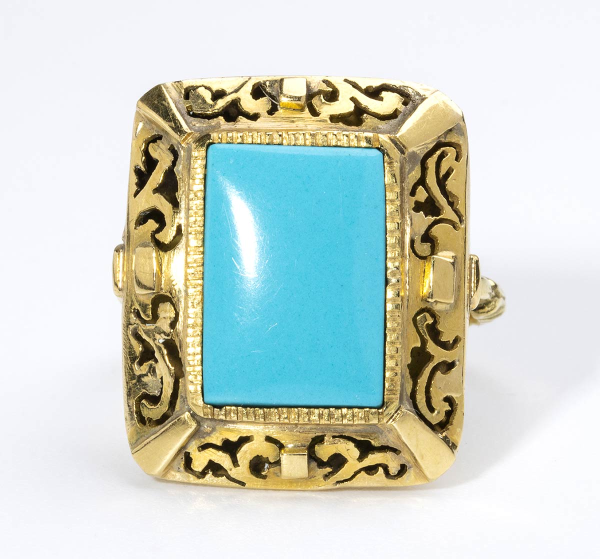 oro giallo 18k, incastonato con cabochon di pasta di turchese.