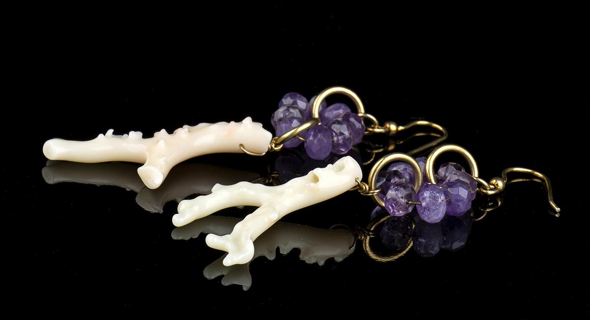 Lot 510 | Paio di orecchini pendenti in argento dorato perla di fiume e fiore in corallo rosa