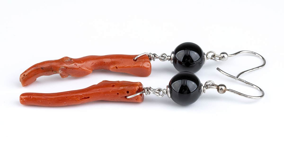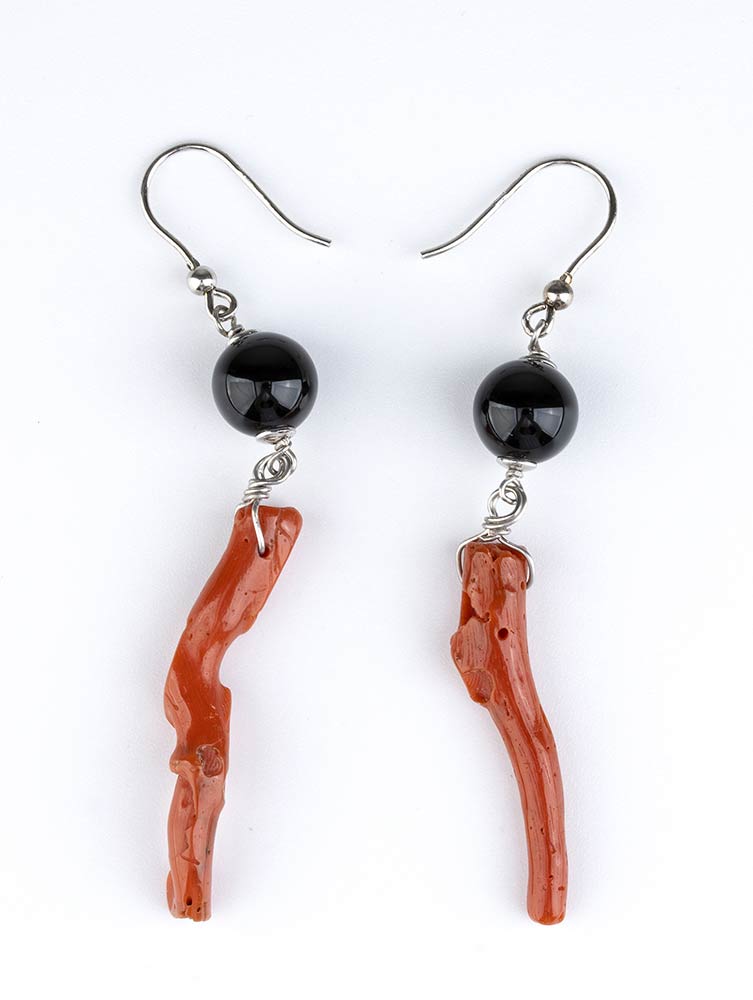 Paio di orecchini pendenti in argento, onice e rametto di corallo Mediterraneo