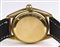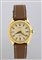 cassa in oro giallo 14k, quadrante dorato con indici a bastone firmato Oyster Perpetual. Movimento a carica manuale. Bracciale in pelle con fibbia ad ardiglione originale Rolex in oro 14k.