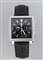 cassa in acciaio, quadrante nero e vetro minerale. Movimento cronografo e datario a carica automatica. Cinturino in pelle, fibbia in acciaio.