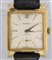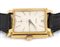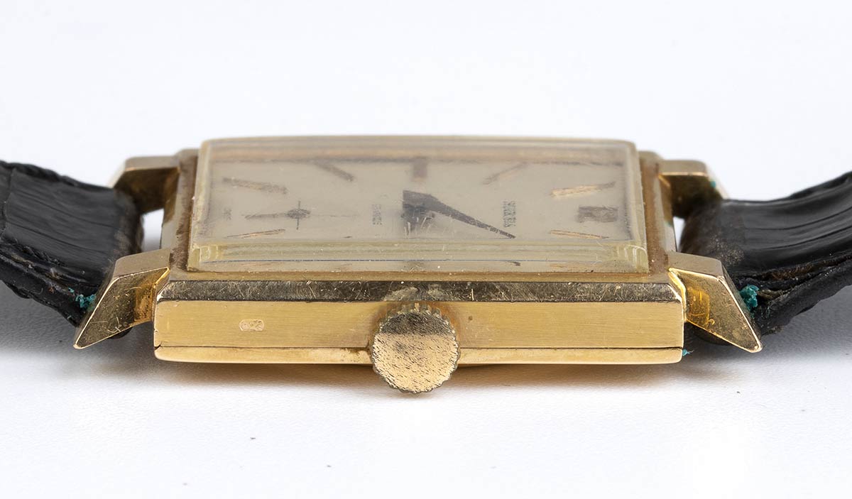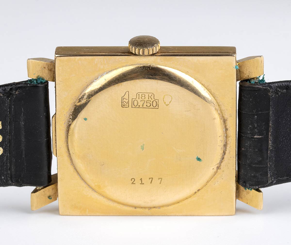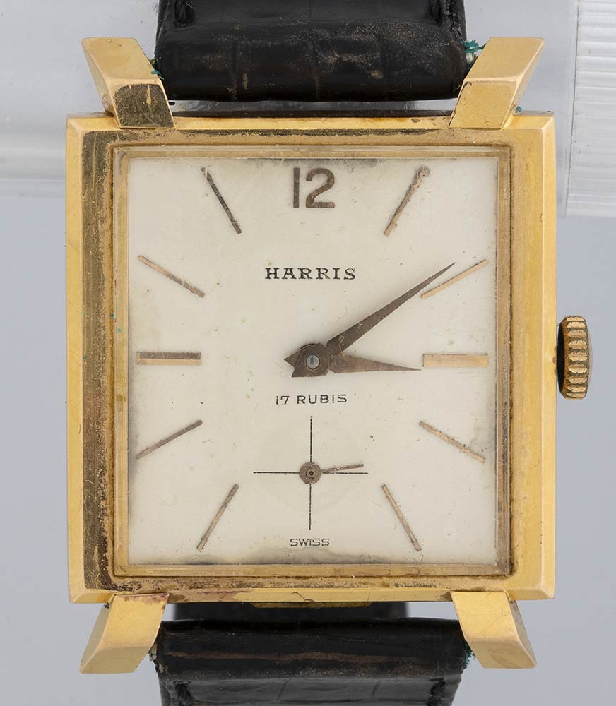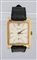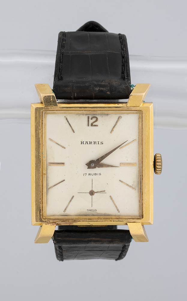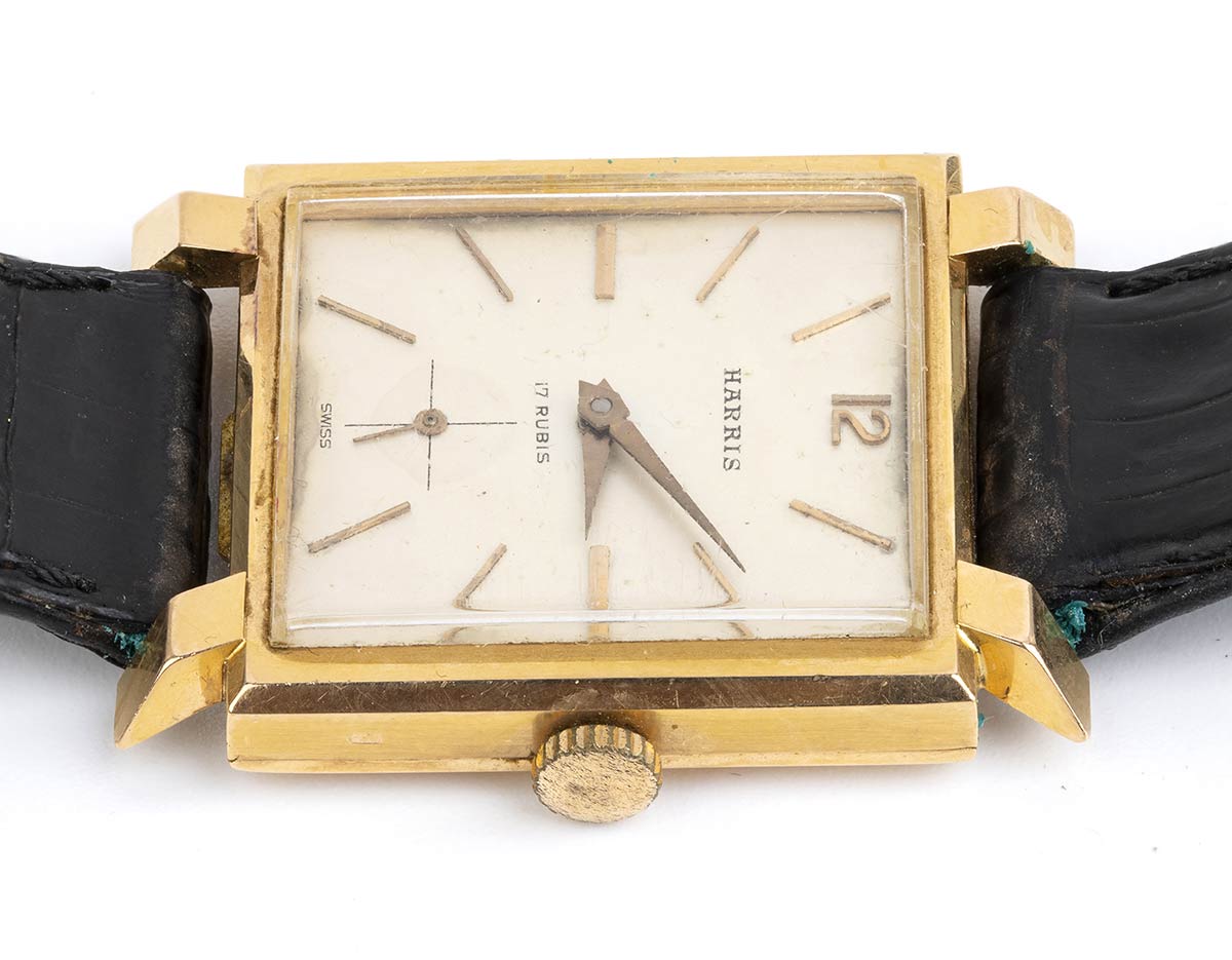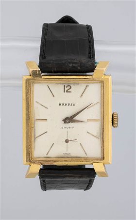 cassa quadrata in oro 18k, quadrante color champagne con indici a bastone, firmato Harris. Movimento meccanico a carica manuale. Cinuturino in pelle con chiusura non originale.