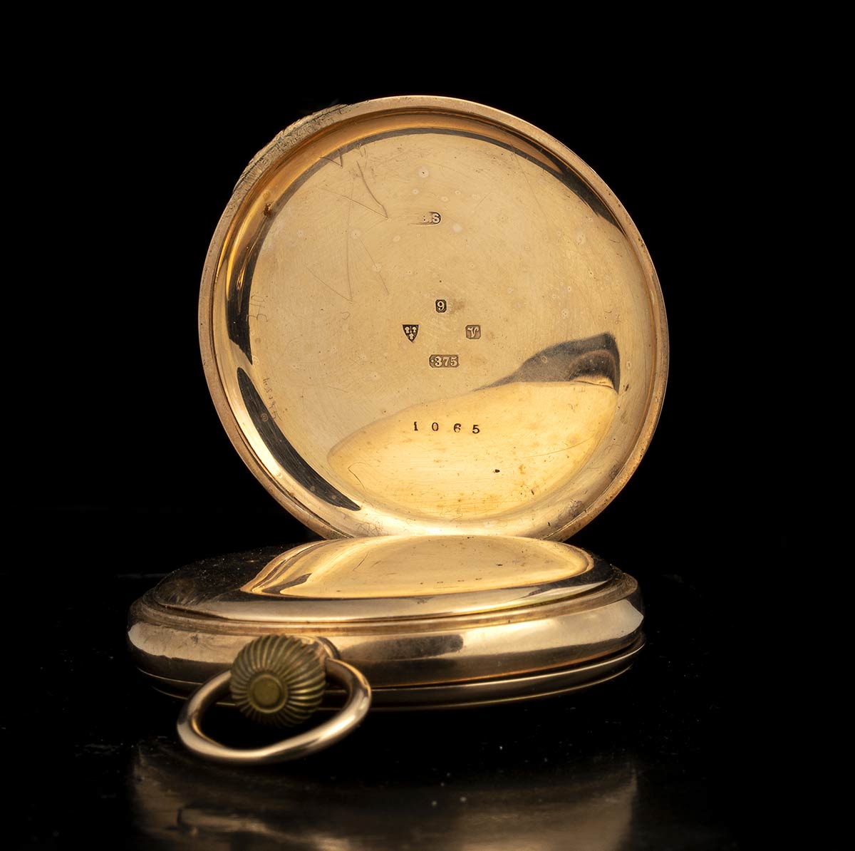 doppia cassa in oro 9k punzonata Chester 1921-22, quadrante in smalto bianco con numeri arabi e sfere nere in acciaio. Carica a remontoir.