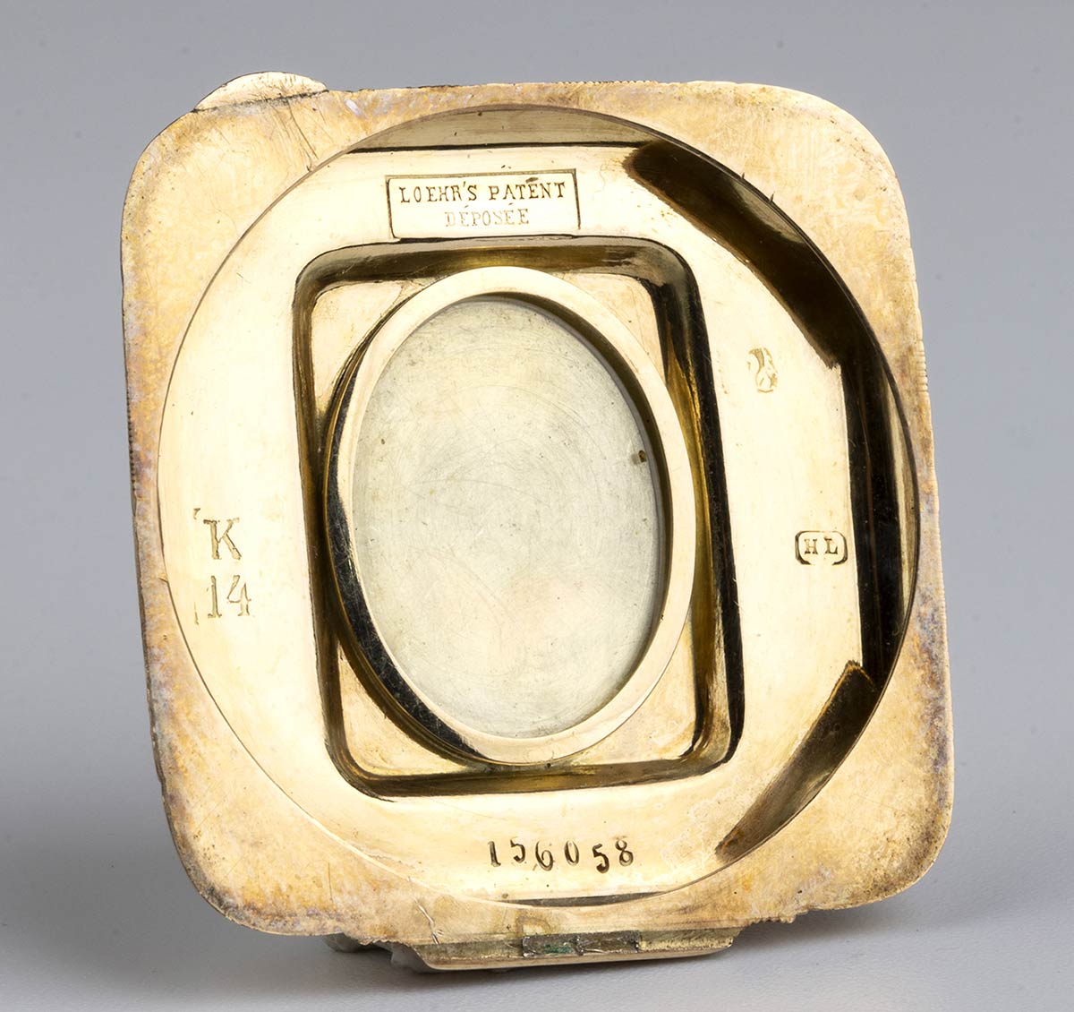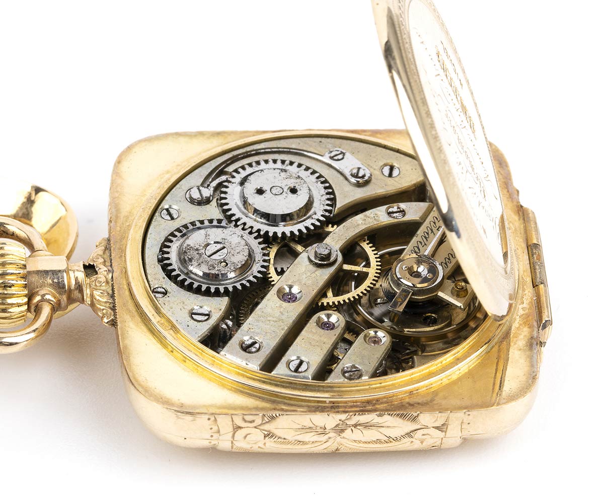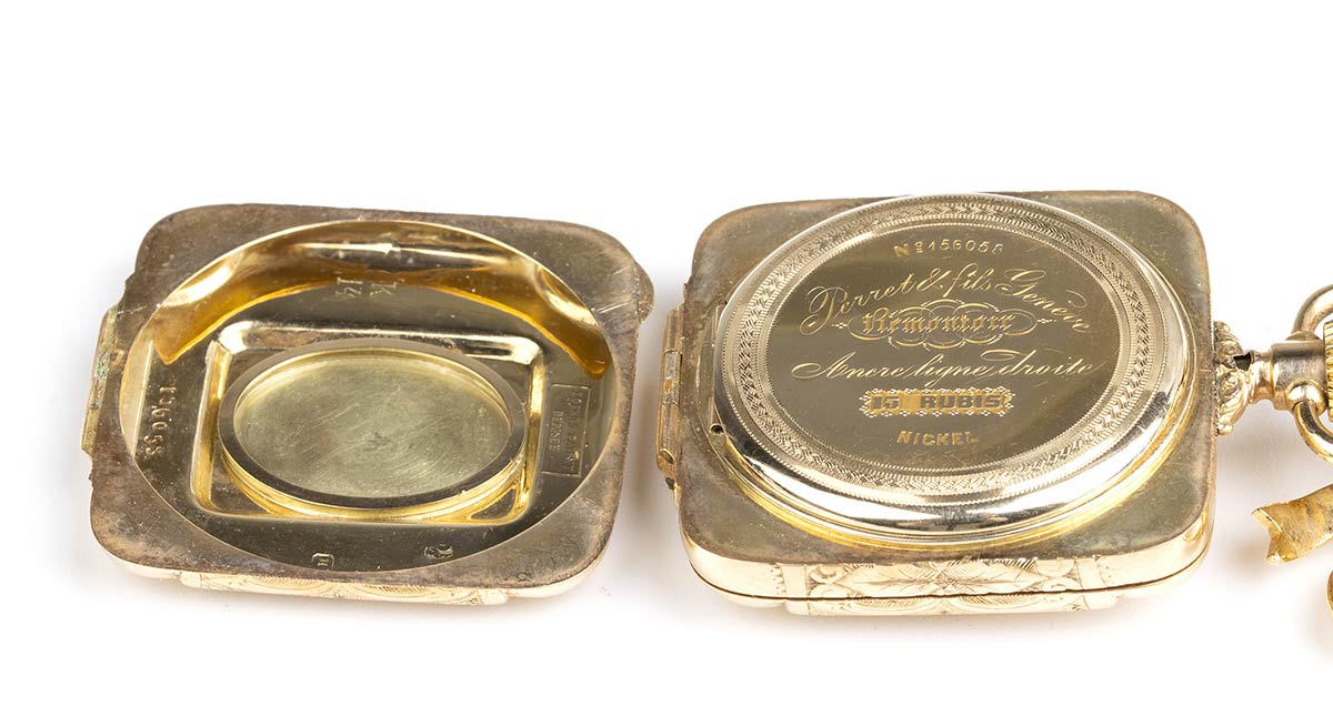 cassa quadrata savonette in oro 14k, quadrante in smalto bianco con numeri romani. Movimento con scappamento ad ancora e carica a remontoir. Punzonato 14K e firmato: "N 156058 - Perret & Fils Geneve - Remontoir - Ancre ligne droite - 15 rubies - 15 rubies".