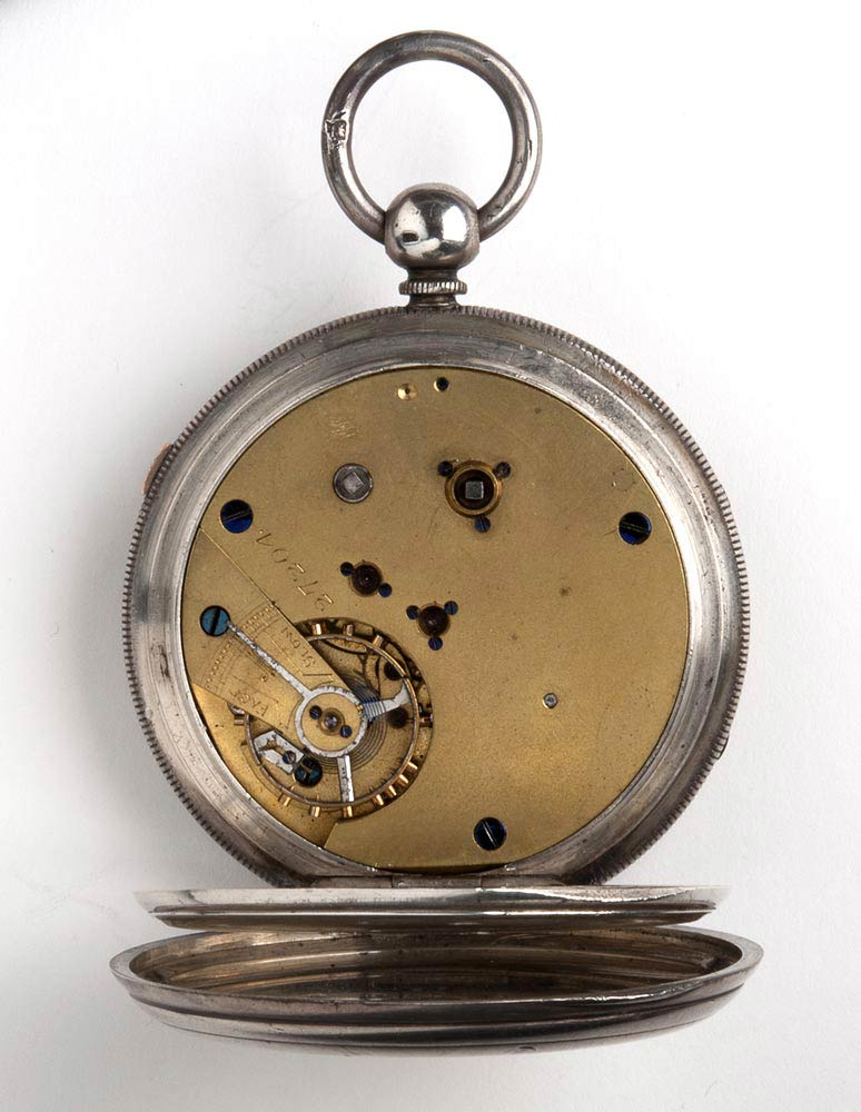quadrante in smalto bianco con numeri romani, cursore laterale per attivare e fermare il movimento. Rimessa dell’ora e carica a chiave. Movimento e cassa nr. 27204. Argento 925/1000, serie completa di marchi Chester 1882-1883, cassaio Joseph Sewill.