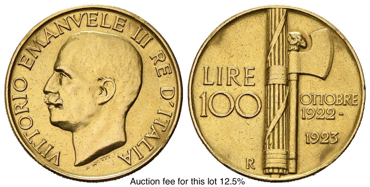 100 Lire 1923 "Fascione". Au 900/1000 (32,16 gr). Gig. 7.