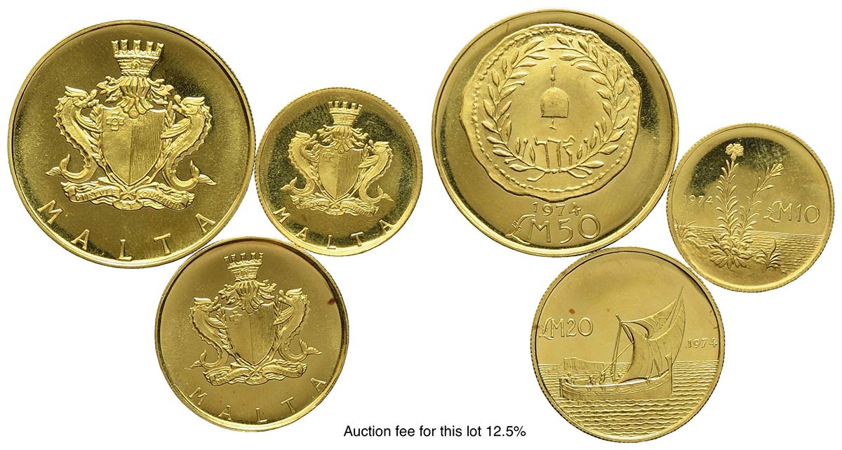 1974. Commemorativa della prima moneta maltese. Au titolo 917 (15 gr; 6 gr; 3 gr). FDC.