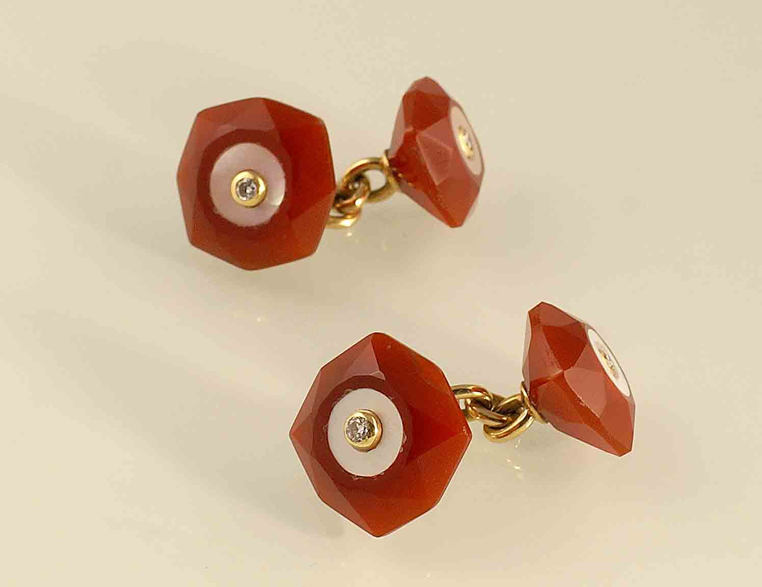 Gemelli in oro giallo 18kt con sezione ottagonale in corniola e madreperla con incastonati quattro diamanti taglio brillante al centro, gr. 9,1.