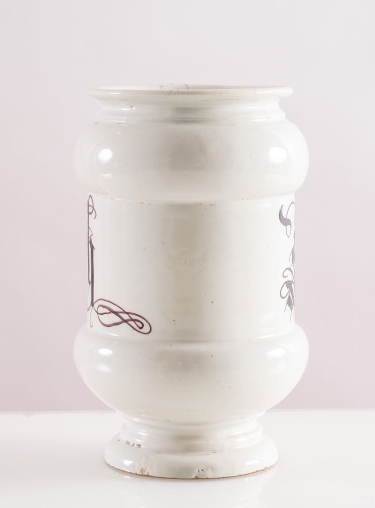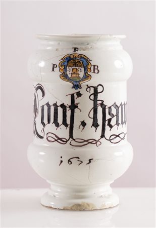 Lot 11 | Albarello in maiolica policroma. Centro Italia, 1675. Cm 20xØ12. (piccoli...