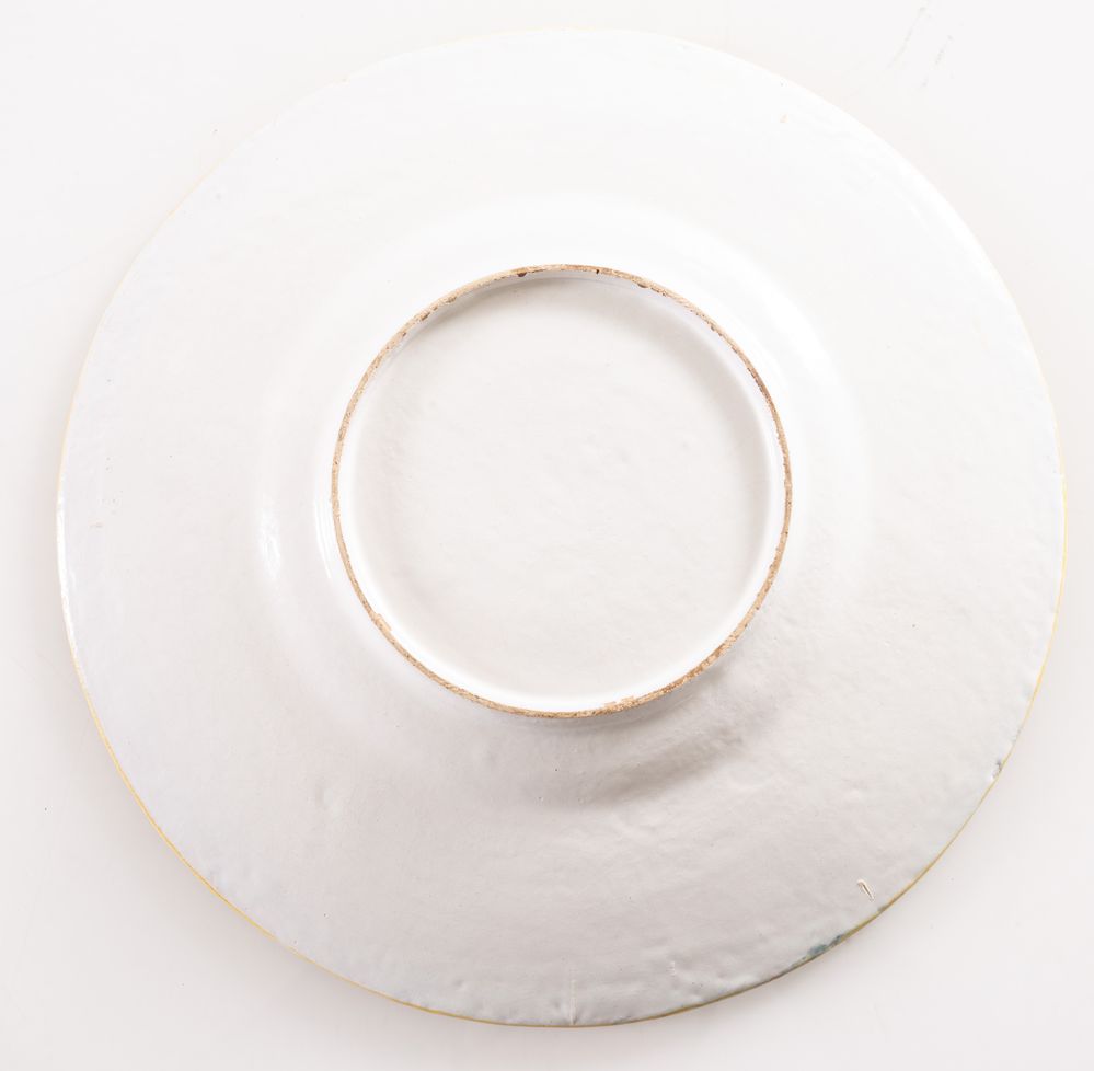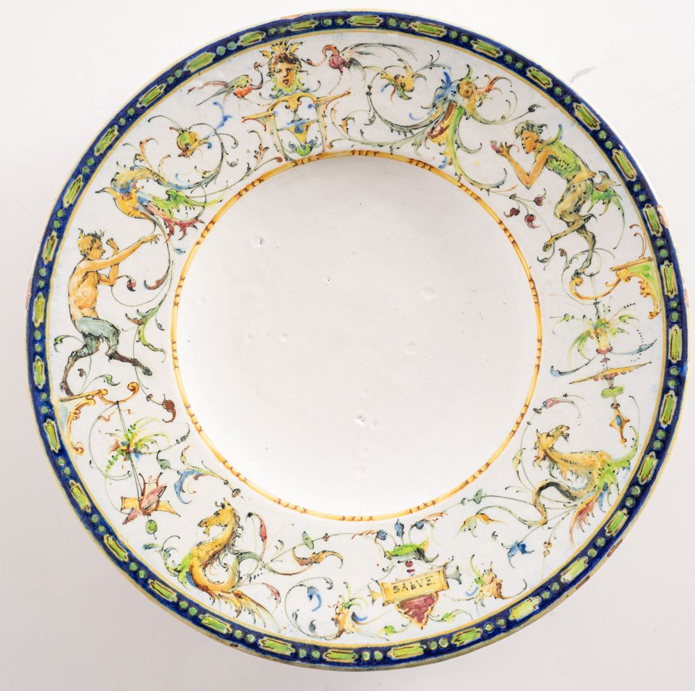 MANIFATTURA ANGELO MINGHETTI (attr.) Bologna, fine del XIX secolo. Piatto da parata in maolica policroma con fascia decorata con motivi a grottesche. Ø: cm 26.