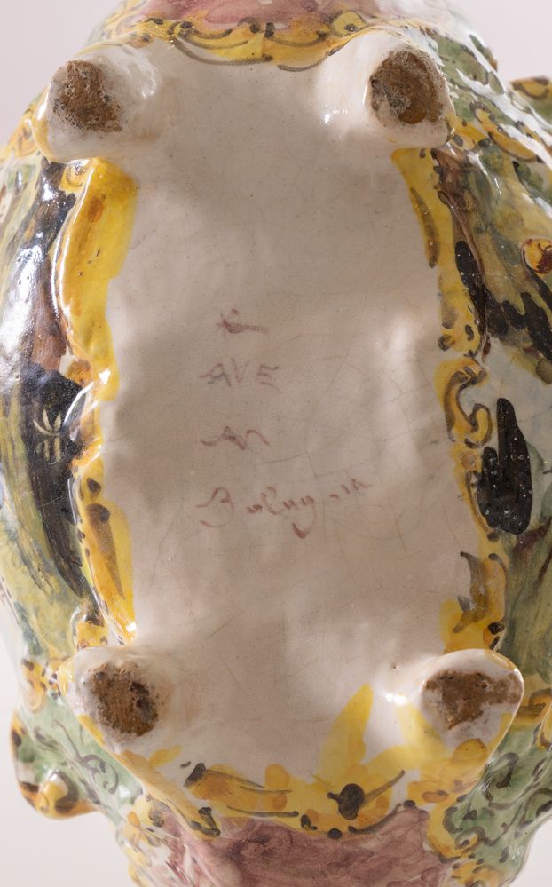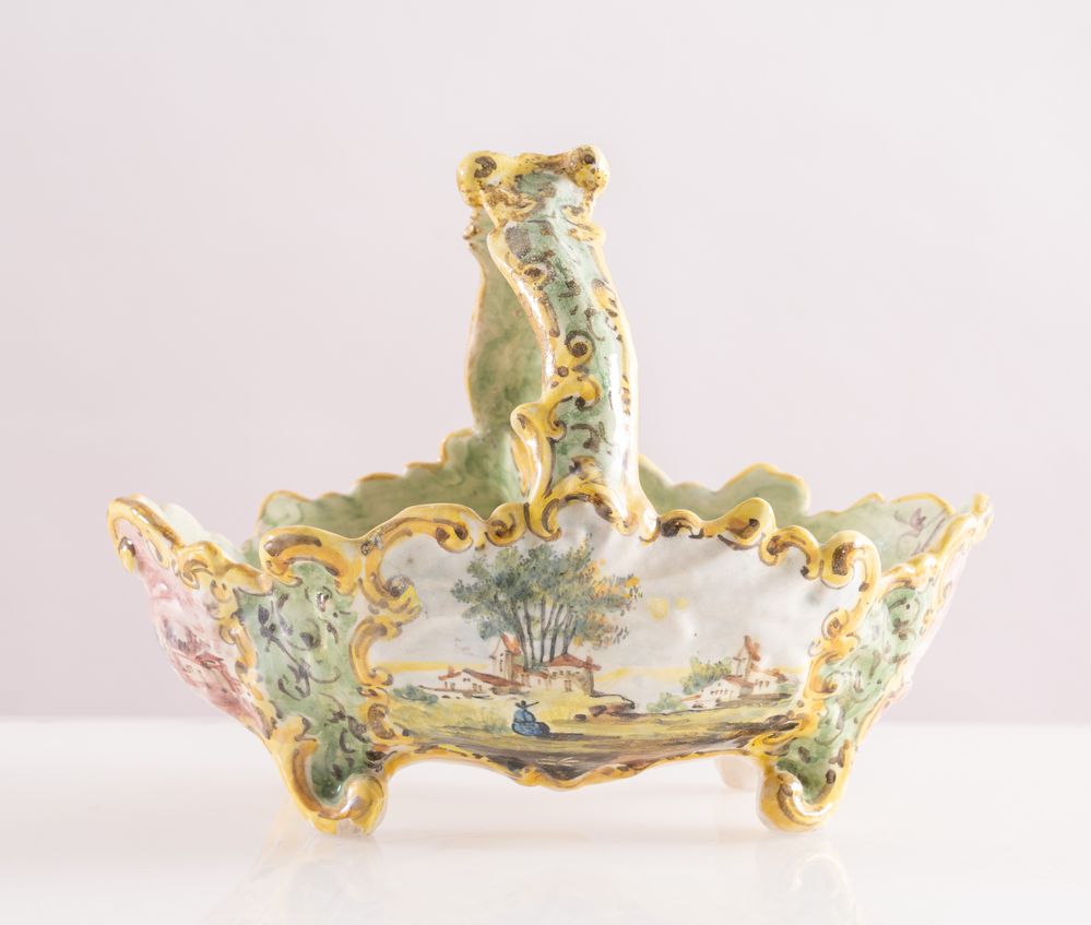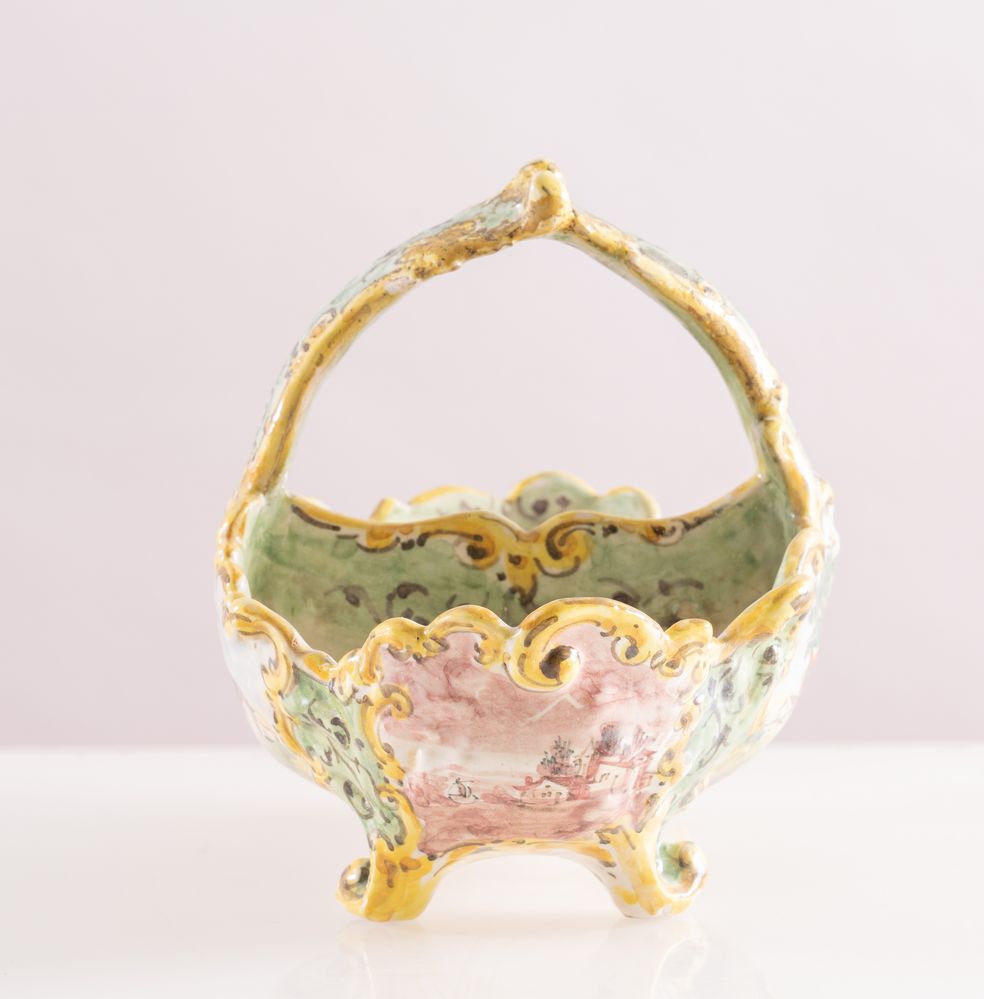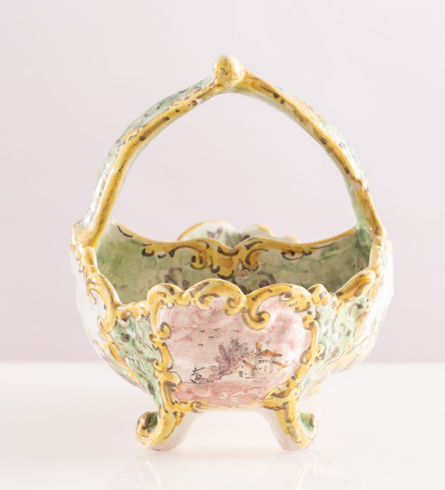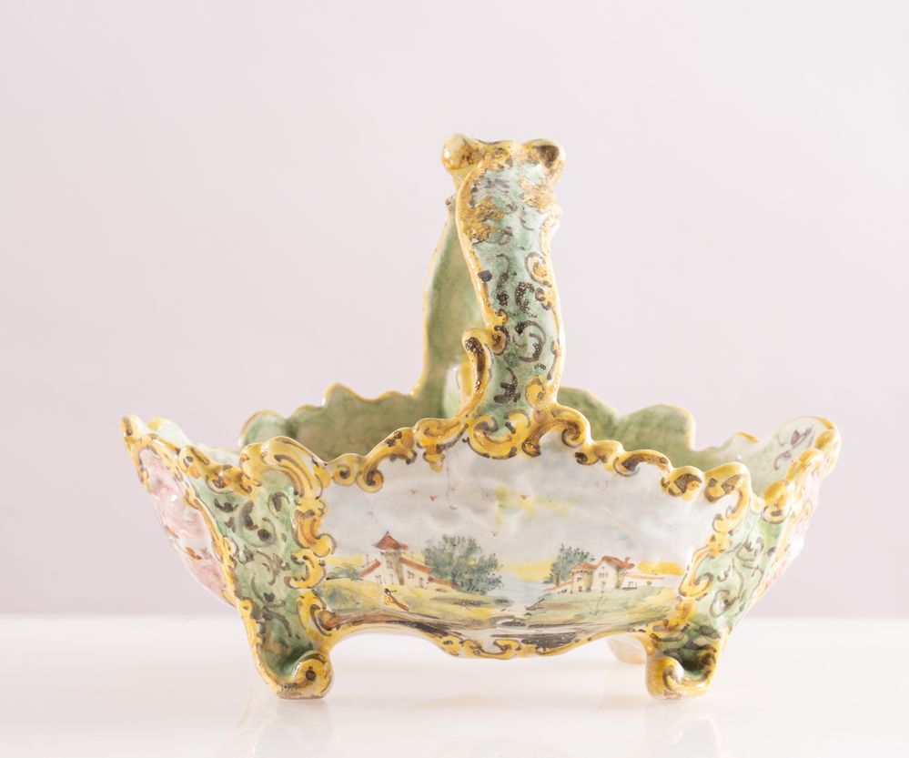 MANIFATTURA ANGELO MINGHETTI, Bologna, fine del XIX secolo. Cestino in maiolica policroma decorato con paesaggi. Opera firmata sotto la base AM Bologna. Cm 15x20x13.