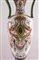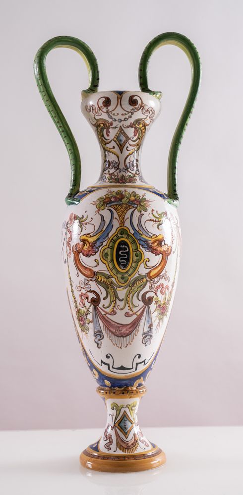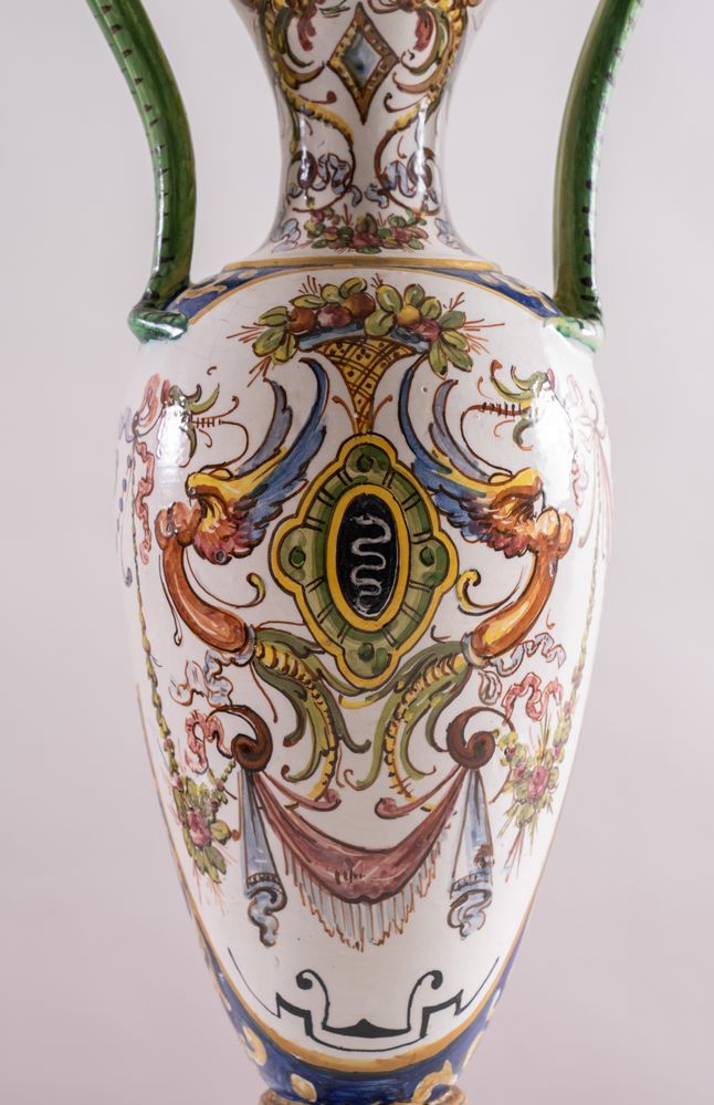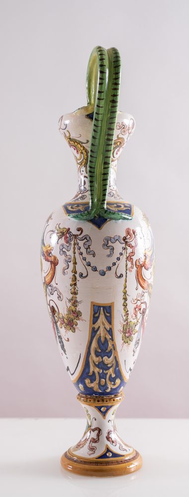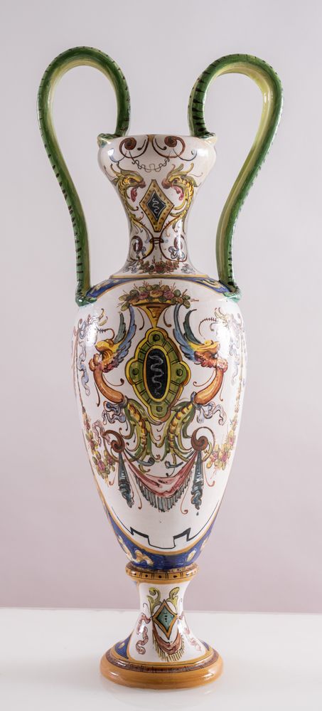MANIFATTURA TRE STELLE, Forlì, inizi del XX secolo. Vaso in maiolica policroma. Sotto la base reca marchio tre stelle, Forlì. Cm 49x11x14. (restauri nei manici)