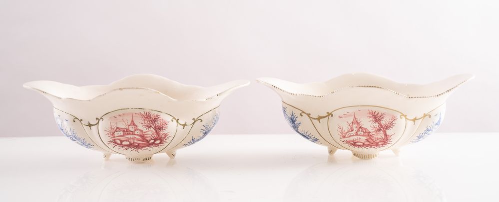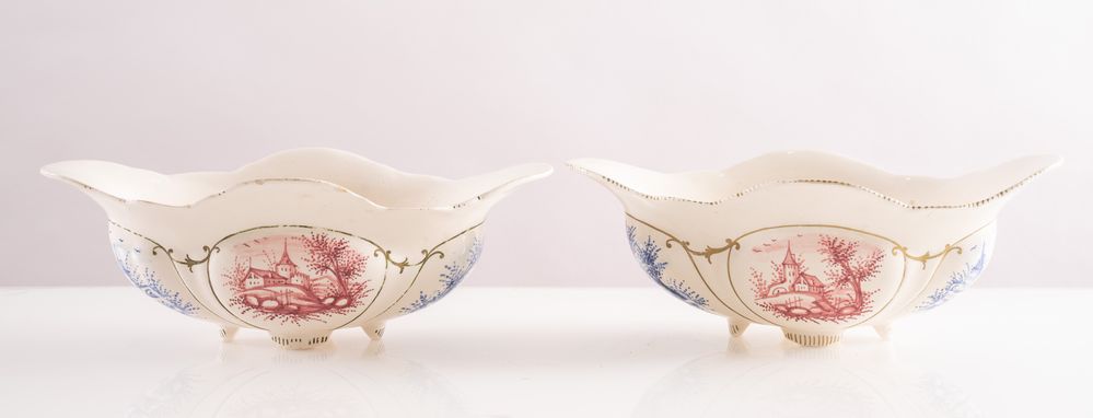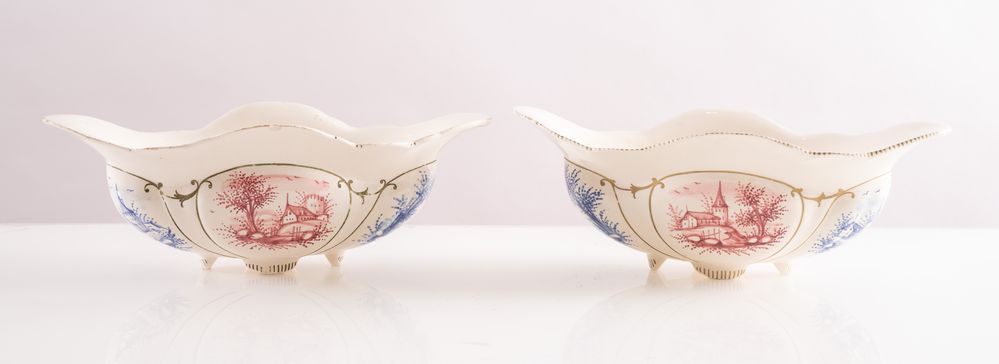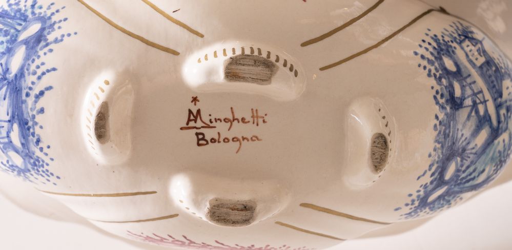 MANIFATTURA ANGELO MINGHETTI, Bologna, 1920 - 1930. Coppia di giardiniere in maiolica policroma decorate con paesaggi. Opera firmata sotto la base A. Minghetti, Bologna. Cadauna di cm 10x28,5x15,5.
