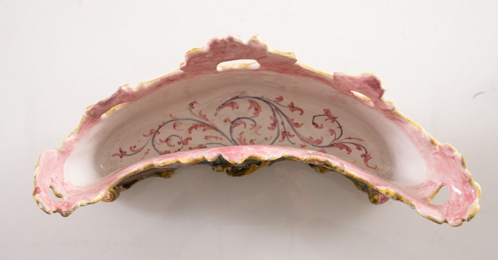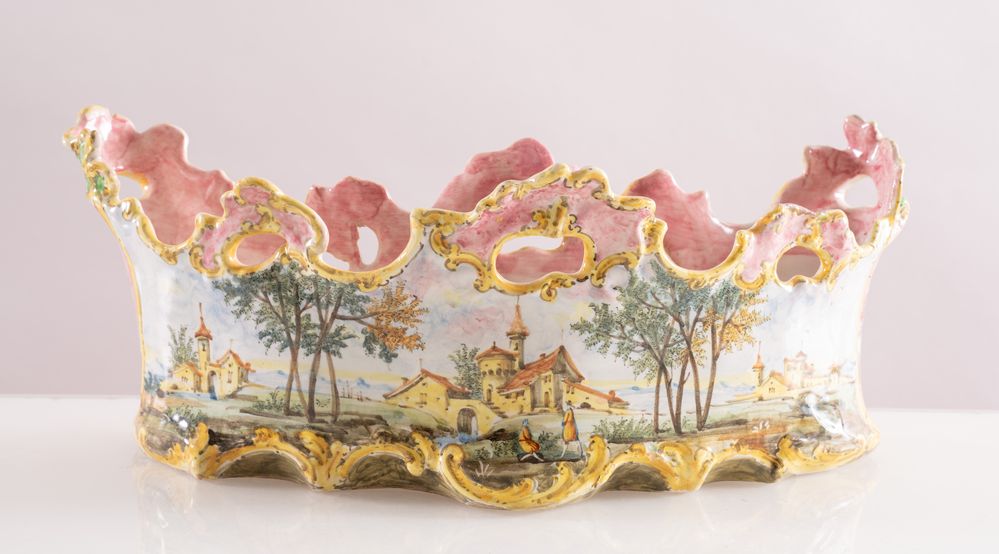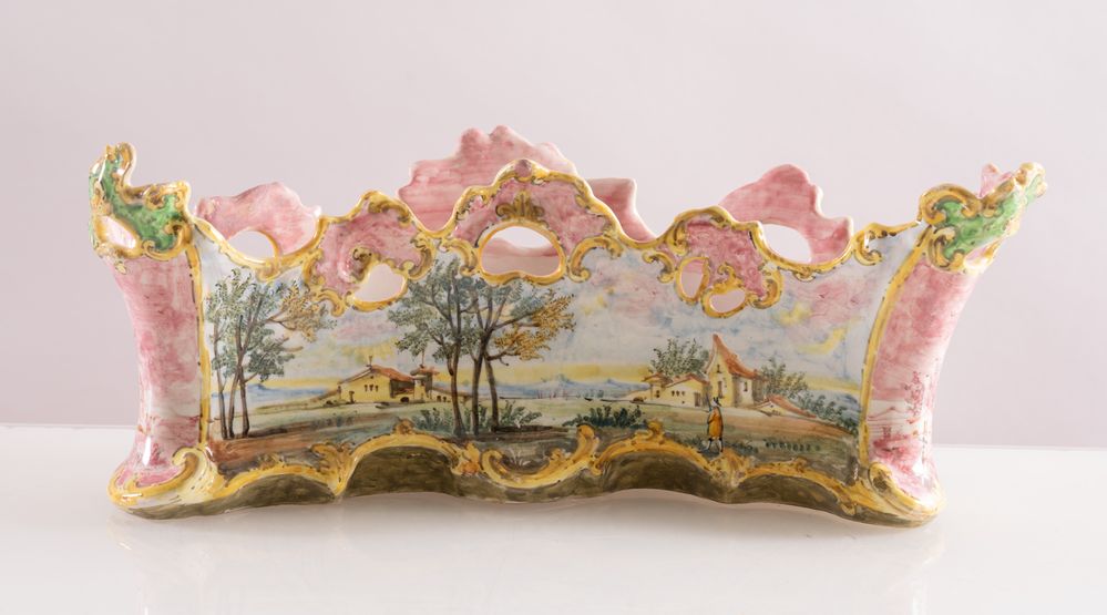 MANIFATTURA ANGELO MINGHETTI, Bologna, 1910 - 1920. Giardiniera a mezzaluna in maiolica policroma, decorata con paesaggi. Opera firmata sotto la base AMF. Cm 12,5x32x14.