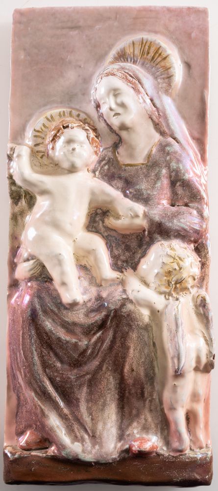 PIETRO MELANDRI (Faenza 1885 - 1976) Formella in ceramica policroma, raffigurante Madonna con bambino e putto, smaltata e riflessata sui toni del rosa. 1950 - 1960. Opera firmata sul lato Melandri. Cm 46x20x2,5.