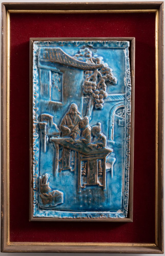 ANGELO BIANCINI (Castelbolognese 1911 - 1988) "Studio cinese". Placca in ceramica policroma. Seconda metà del XX secolo. Cm 28x14,5.