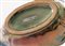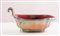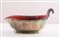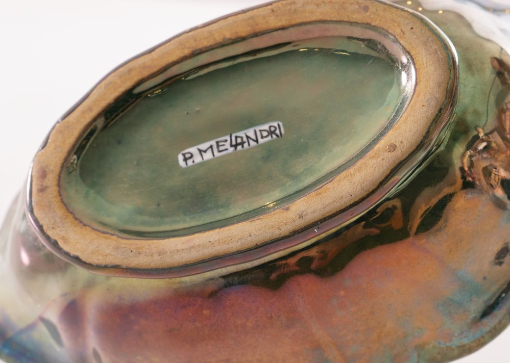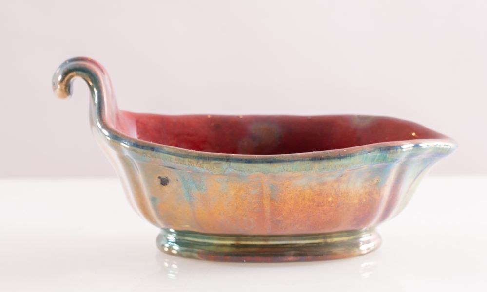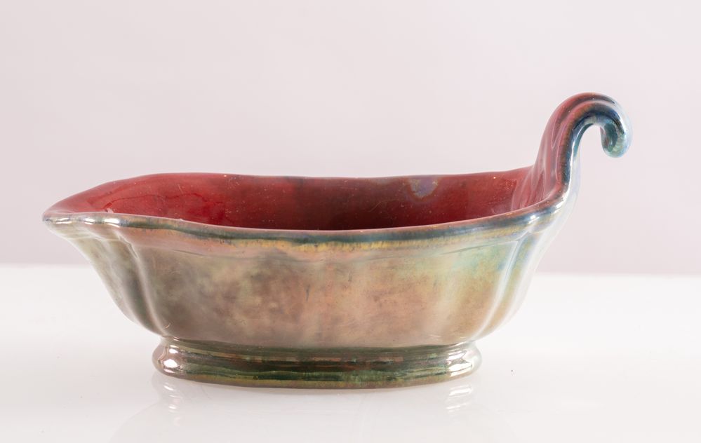 PIETRO MELANDRI (Faenza 1885 - 1976) Salsiera in ceramica smaltata e riflessata sui toni del verde e del rosso. 1950. Opera firmata sotto la base P. Melandri. Cm 9x19x11,5.