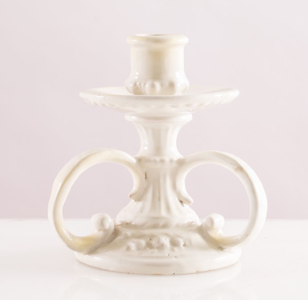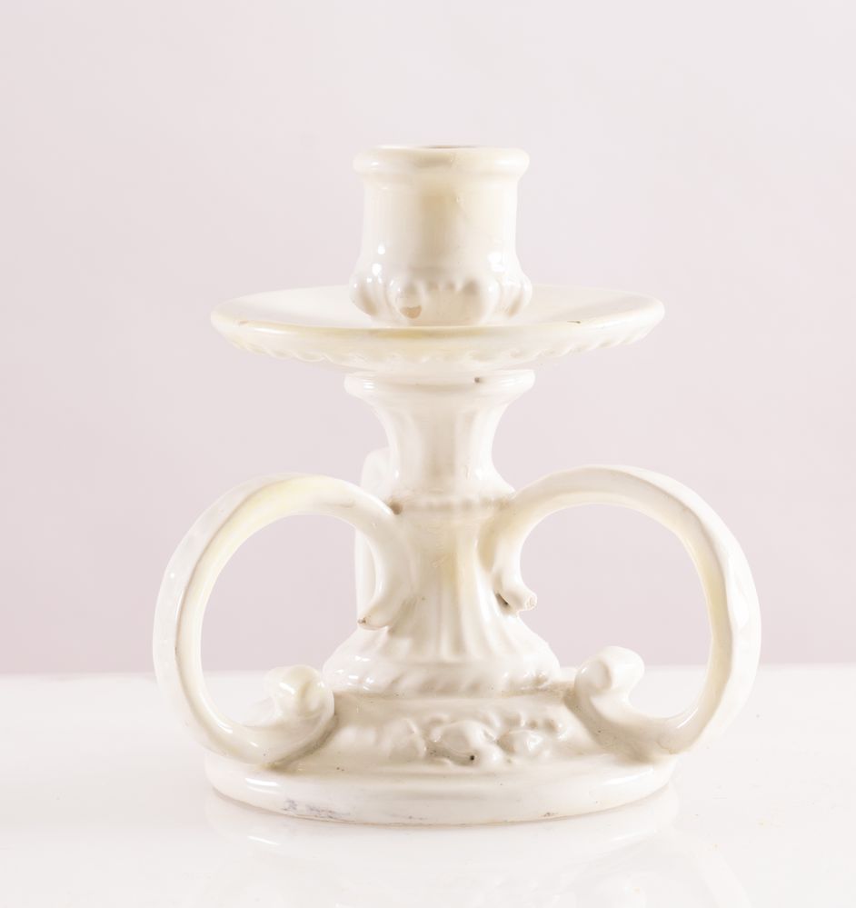 MANIFATTURA ANGELO MINGHETTI, Bologna, 1920 - 1930. Portacandele in maiolica bianca. Opera firmata sotto la base AM e scritte non decifrate. Cm 14x12x12.