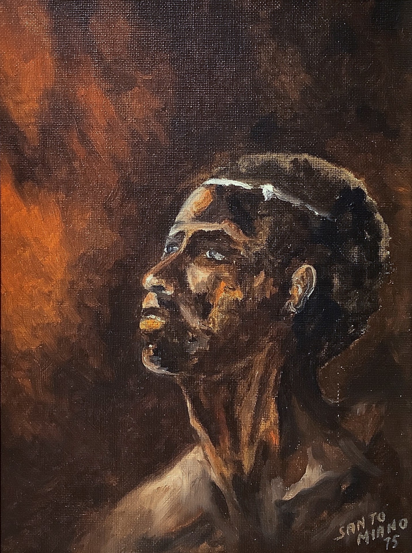 Santo Miano (XX secolo) - Personaggio, 1975 24x18 cm, in cornice 46x39 cm Dipinto a olio su tela Firmato in basso a destra Santo Miano e datato '75