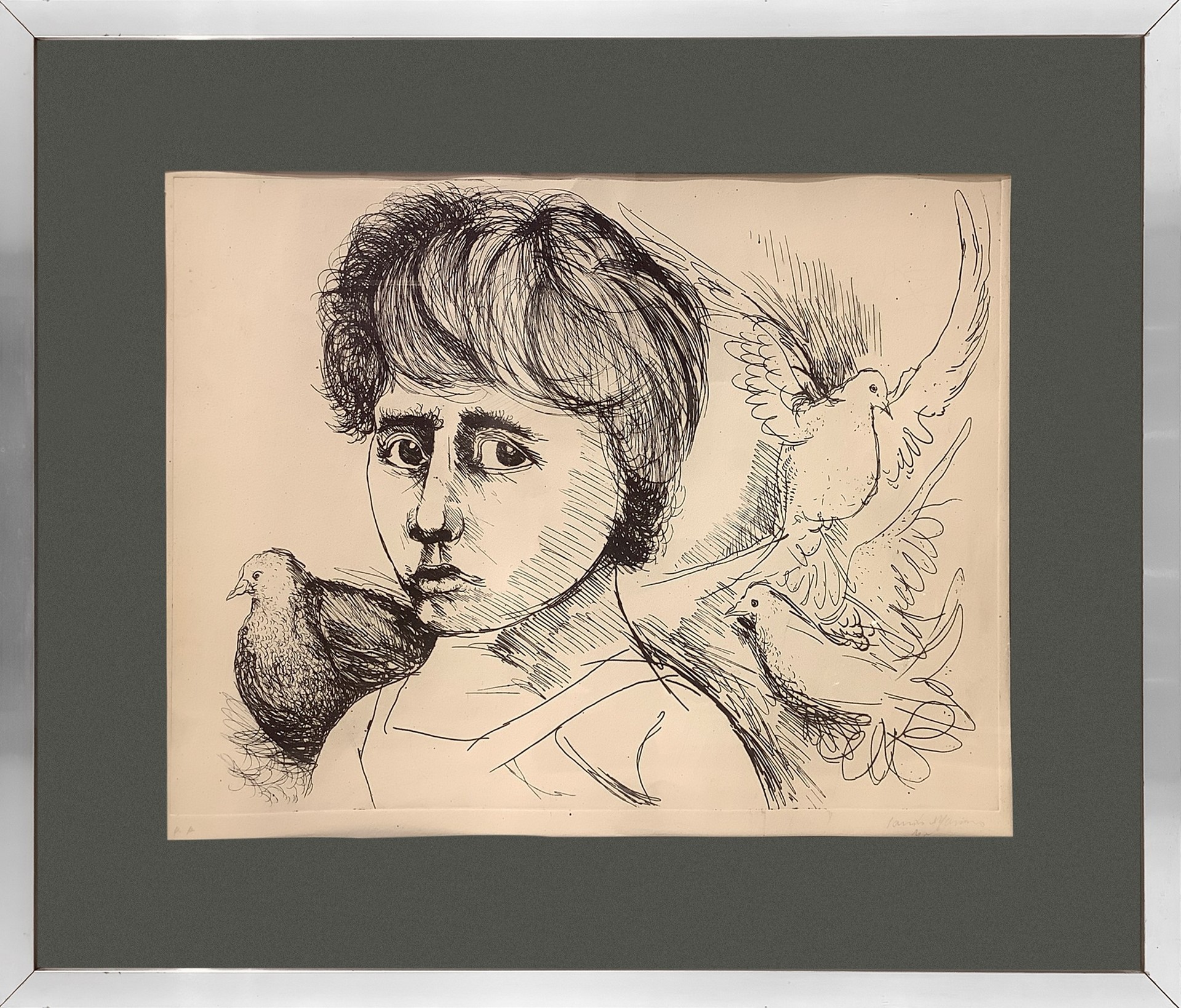 Santo Marino (Militello val di Catania 1924-1991) - Bambino con colombe P.A in cornice 55x66,5 Litografia