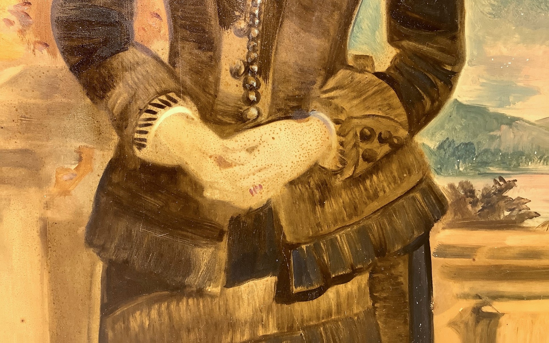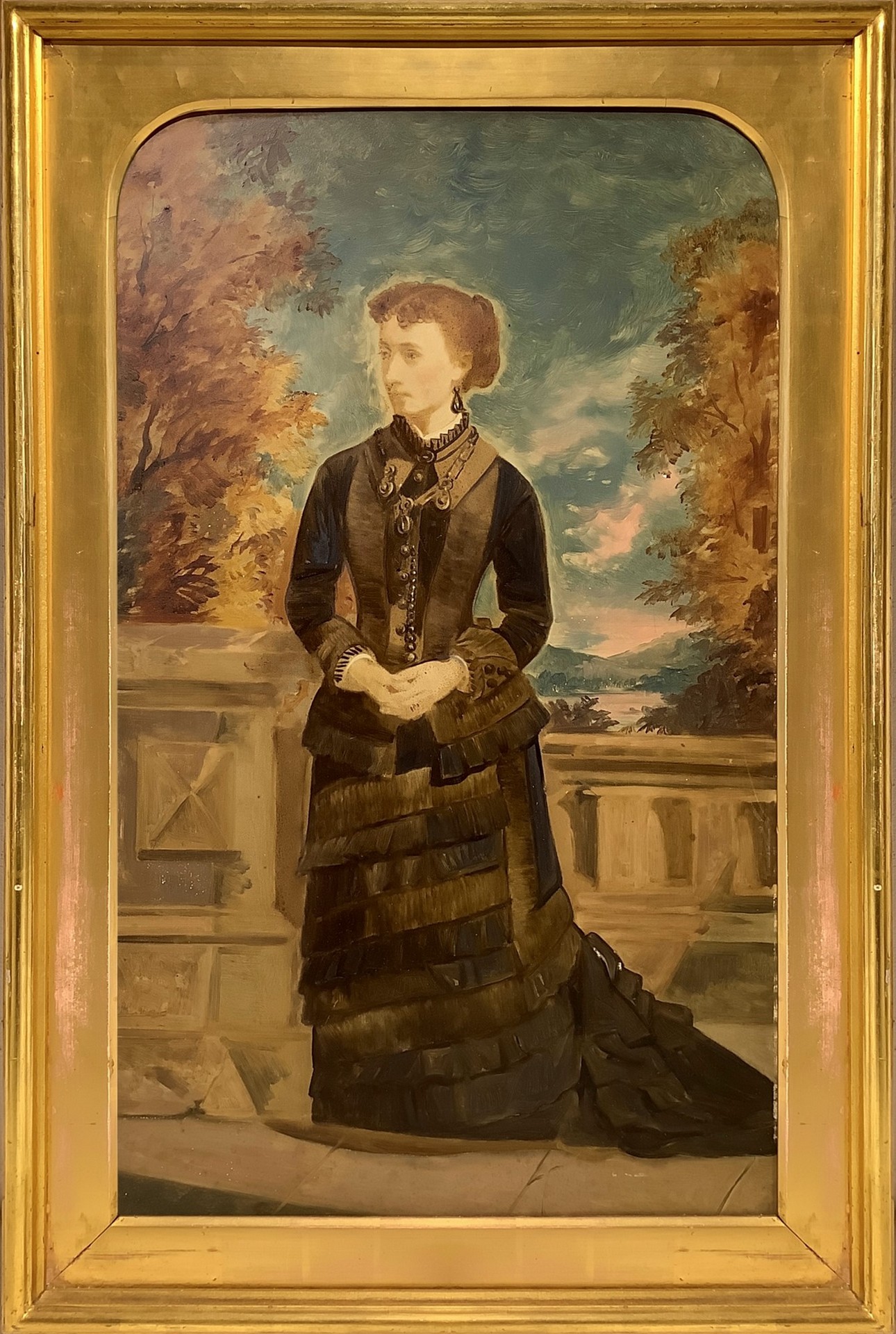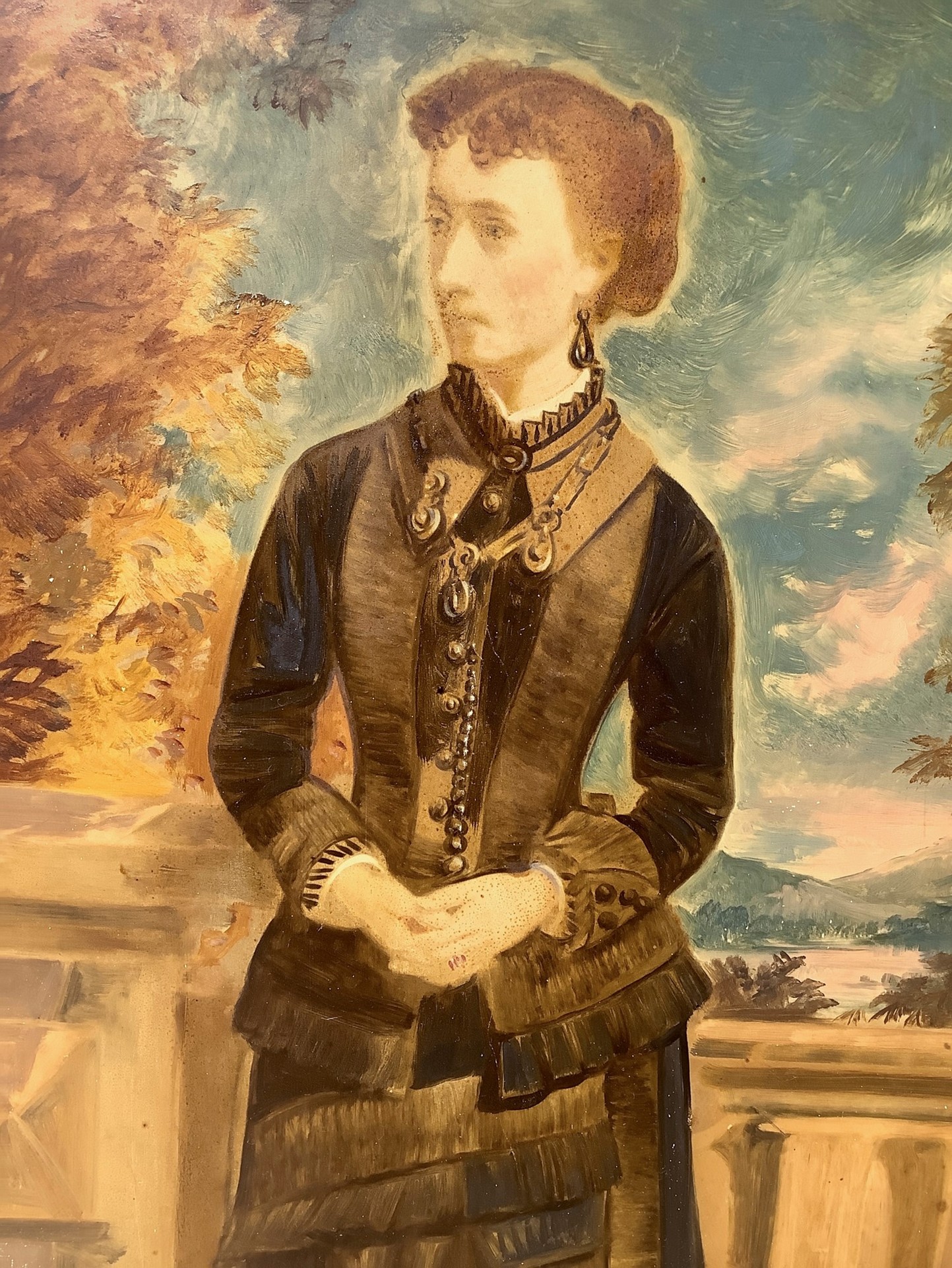 Ritratto di nobildonna sul balcone con sfondo paesaggistico, 20° secolo