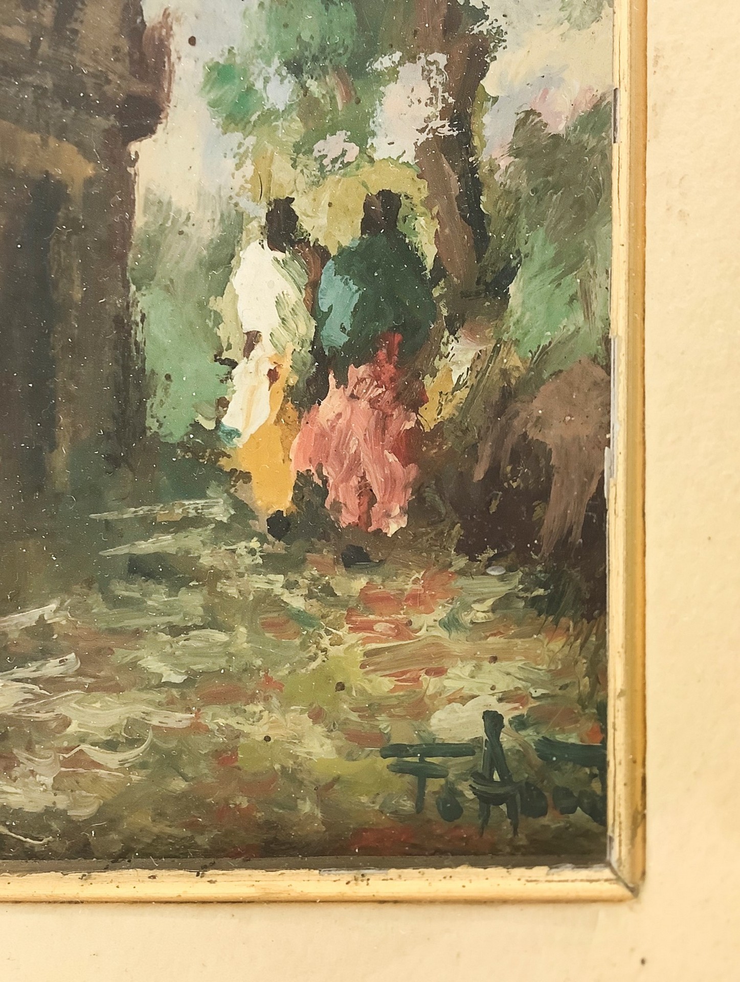 Dipinto raffigurante paesaggio campestre con case e personaggi, Nineteen° secolo h cm 52x102 Pittore Italiano di fine XIX Secolo. Firmato in basso a sinistra F.Nannini