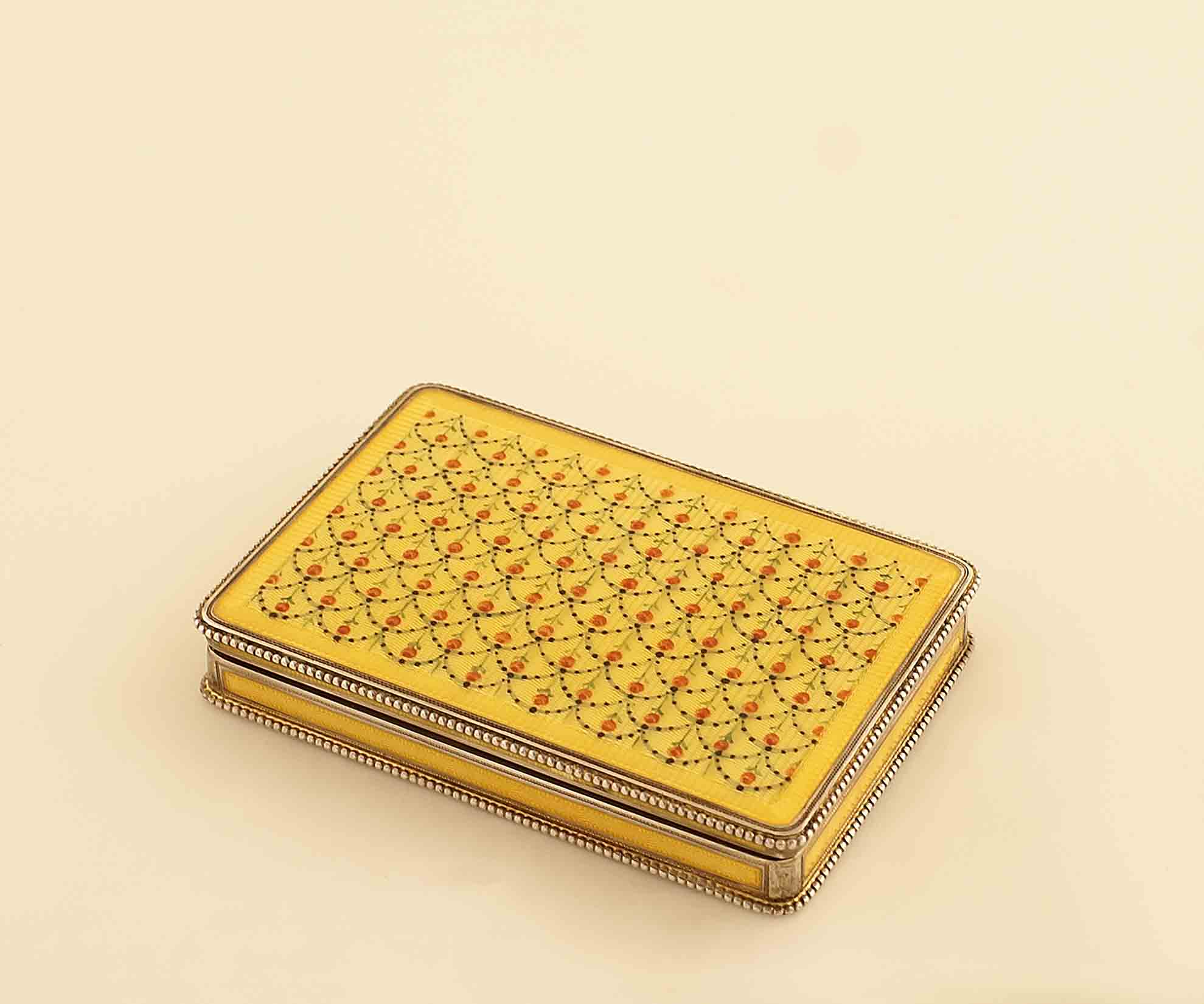 Scatola di forma rettangolare in argento e smalto policromo guillochè nella tonalità del giallo, primi anni del XX secolo, cm. 1,5x9x6.