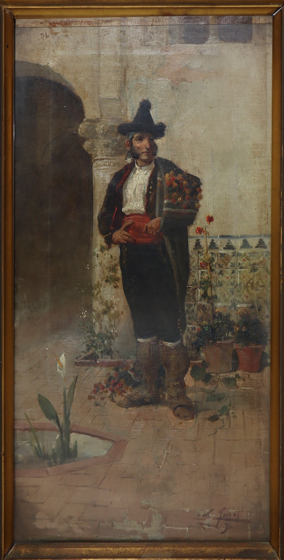 Personaggio in costume popolare romano, Nineteen° secolo h cm 40 x cm 20; in cornice cm 64 x cm 44 Olio su tela Firmato in basso a destra Torres e datato Roma 90.