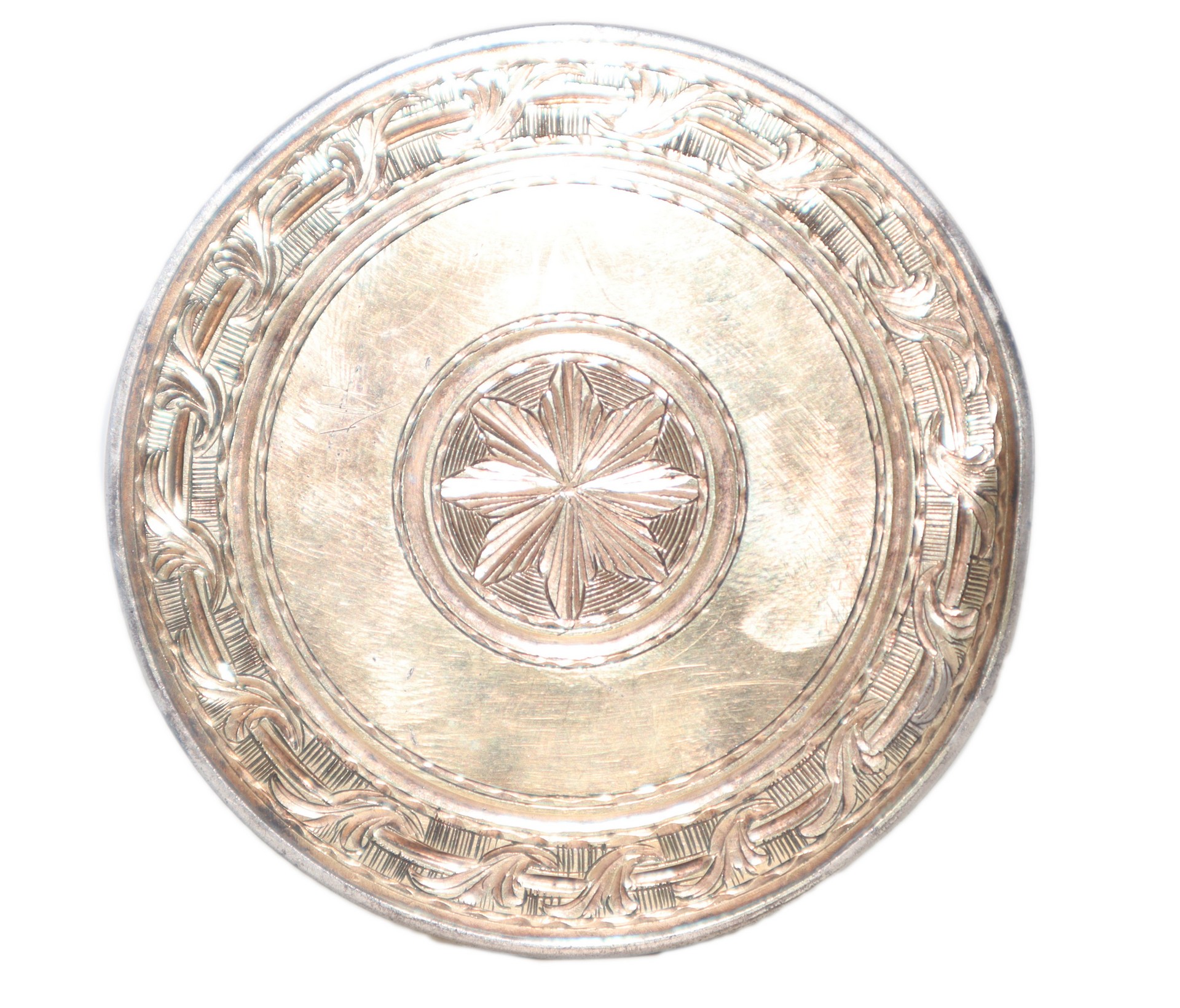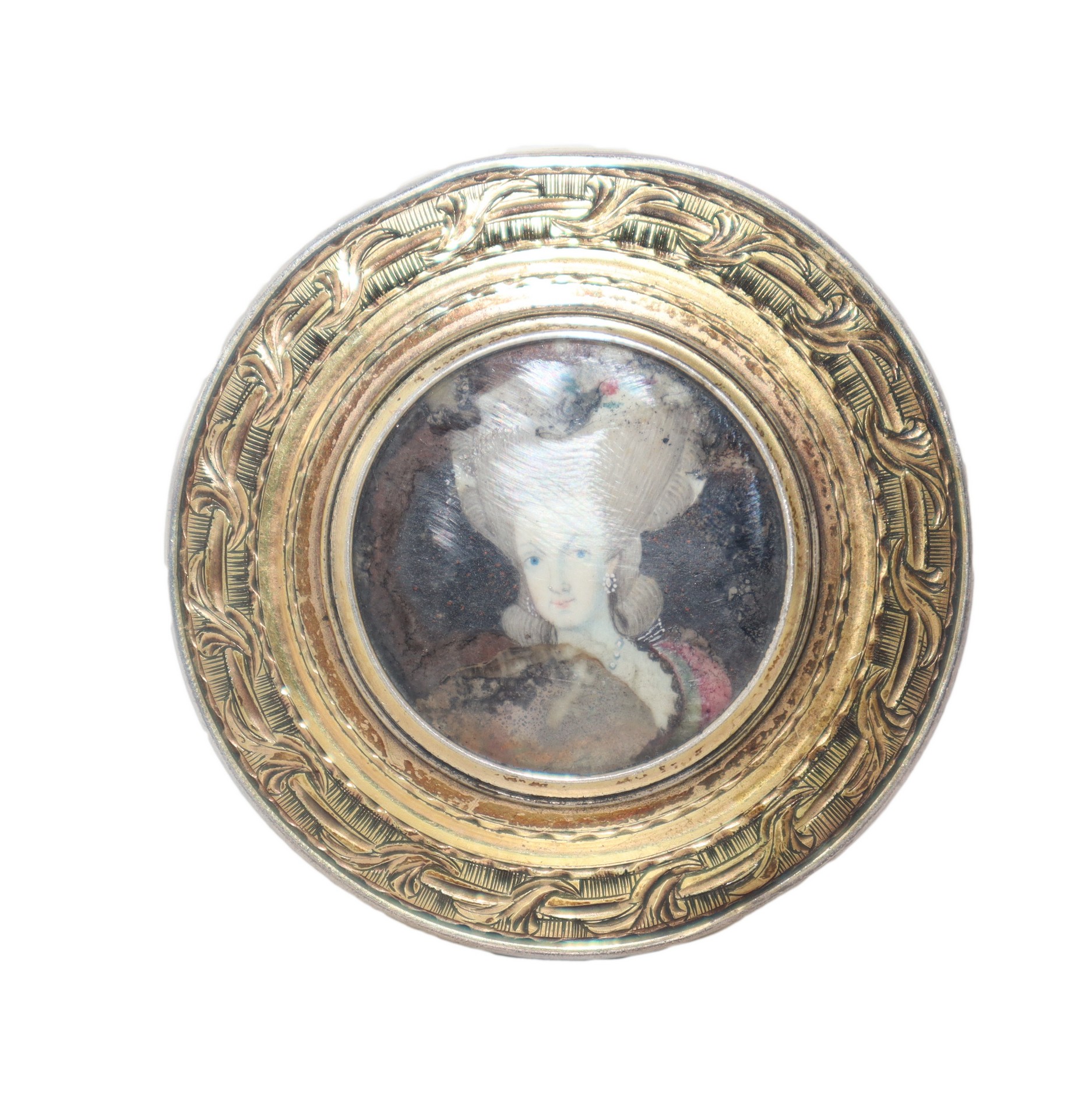 Scatola rotonda con miniatura centrale di Maria Antonietta, nineteen° secolo h cm 3, diametro cm 7 In metallo dorato, interno in tartaruga