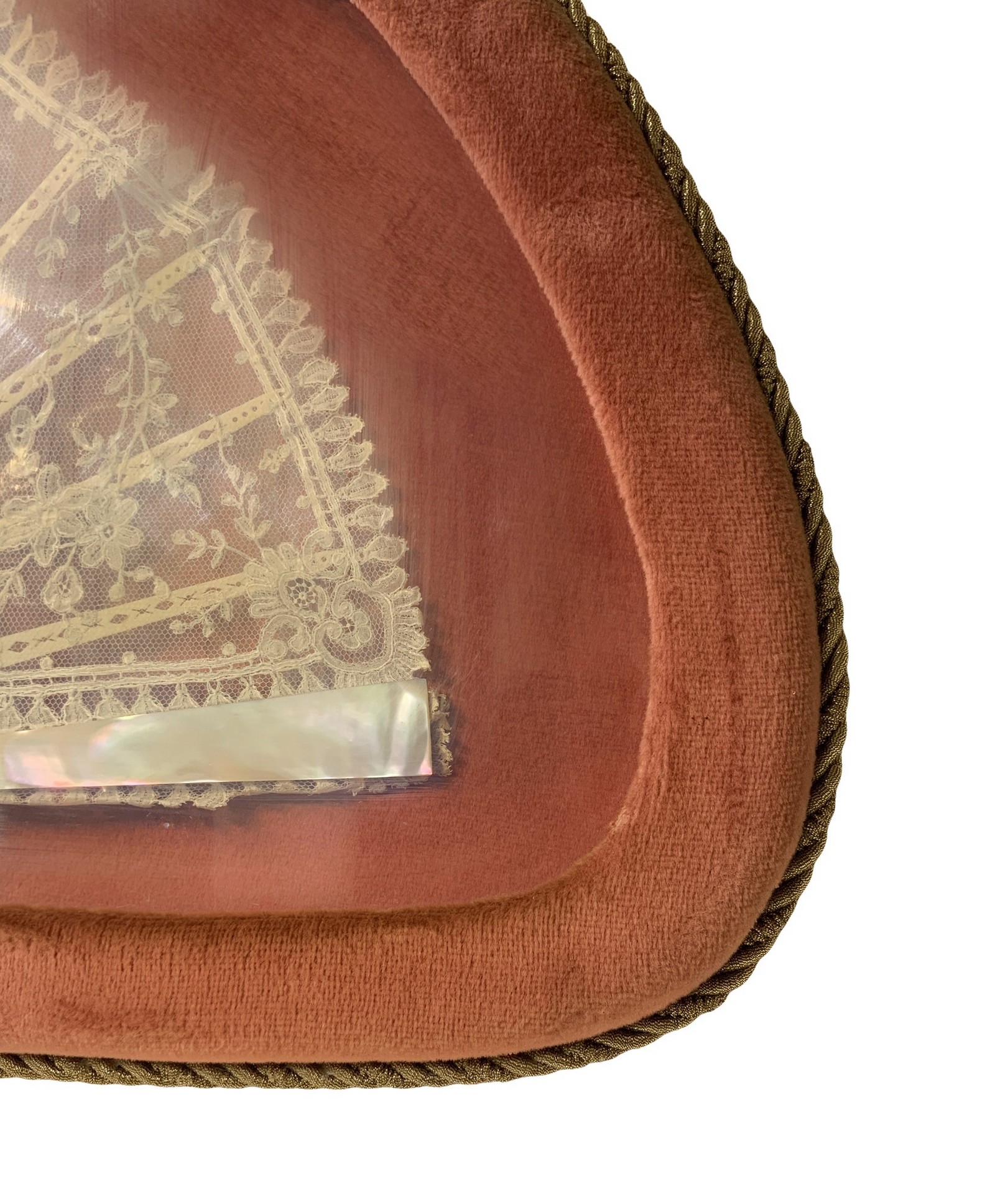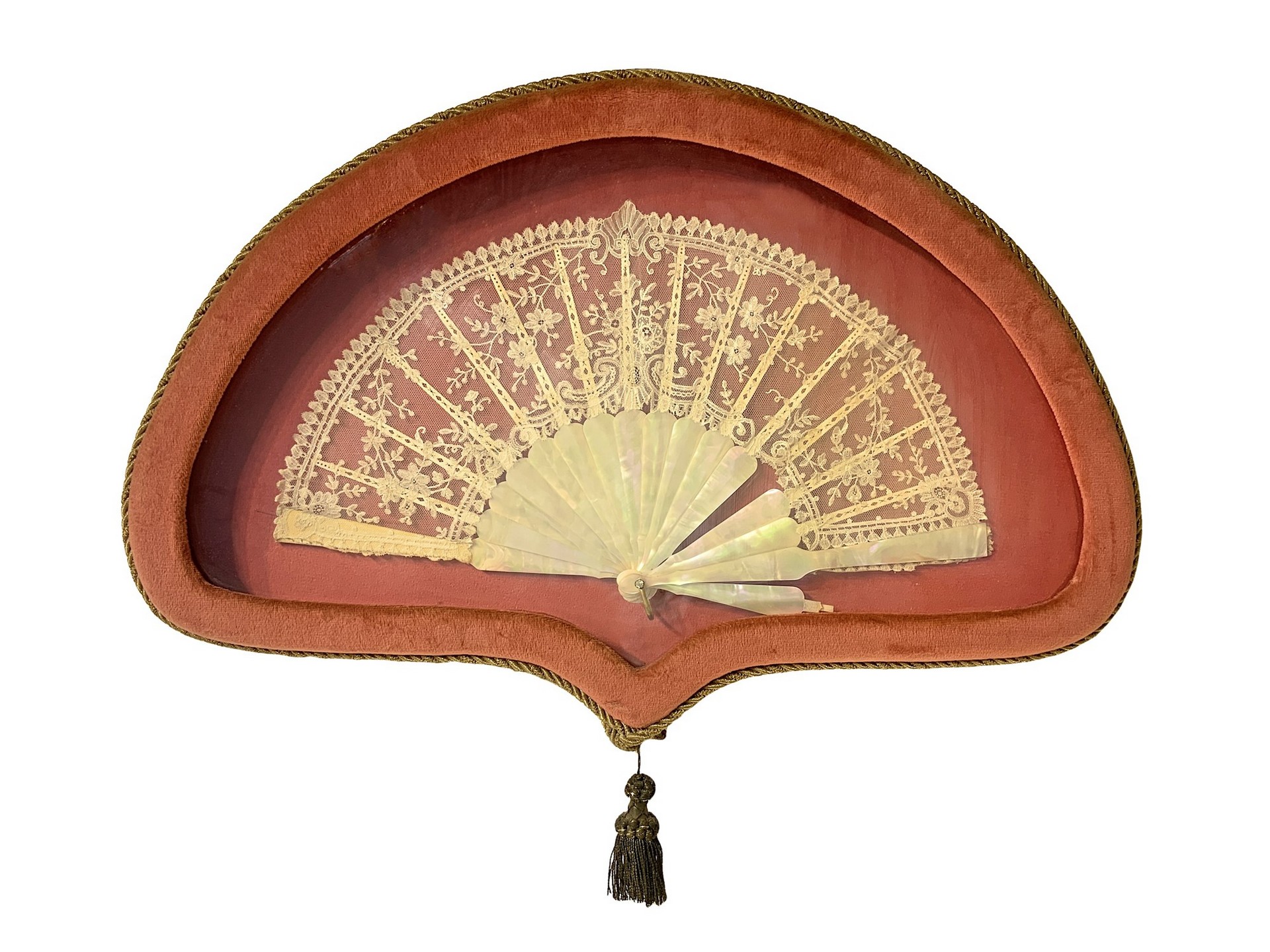 Ventaglio in merletto Chantilly 41x62 cm Stecche in madreperla, in ventagliera di velluto, colorsalmone Stecche in madreperla, in ventagliera di velluto, colorsalmone