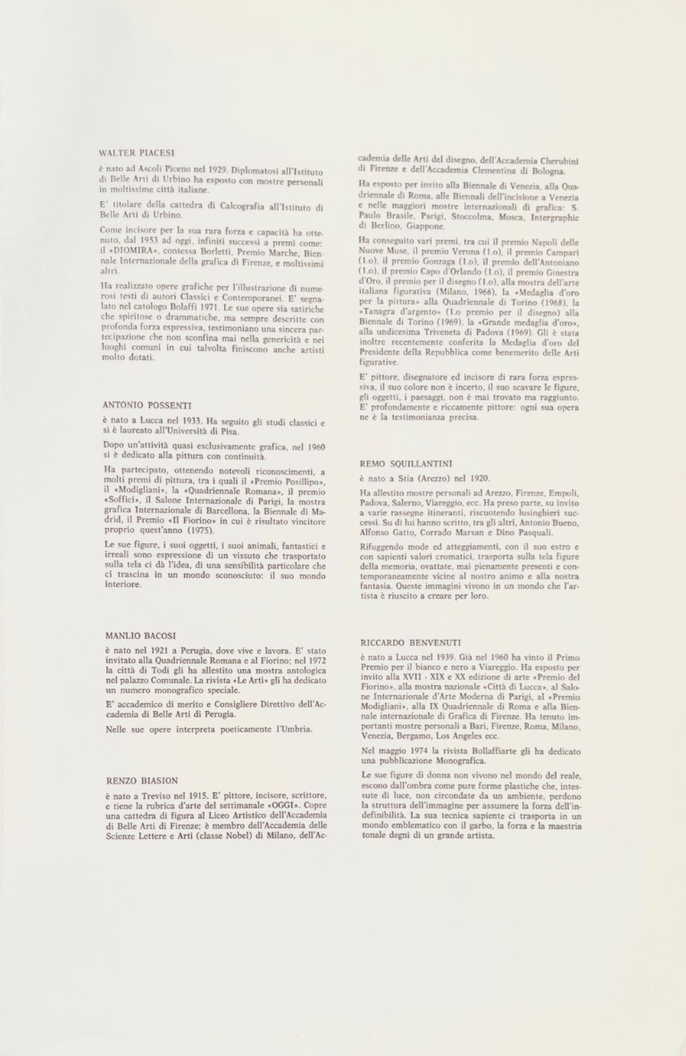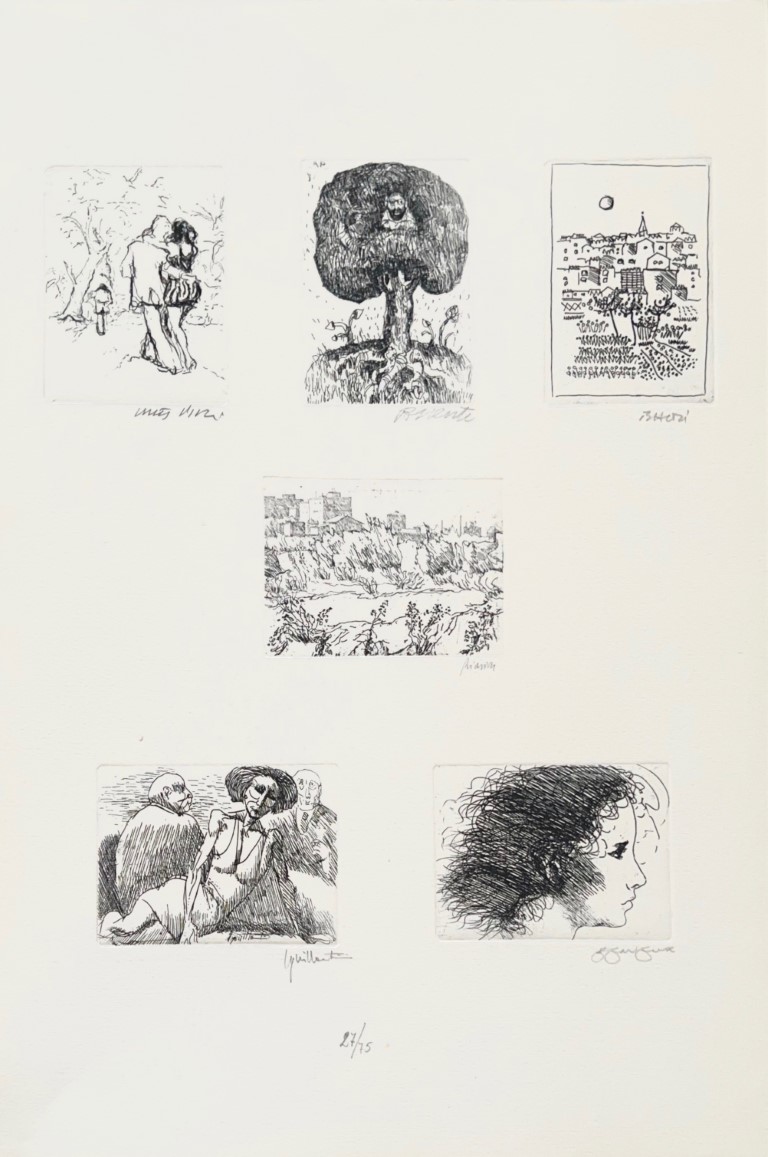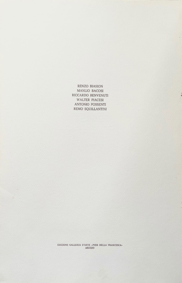 foglio con 6 incisioni di 6 autori diversi: Renzo Biason, Manlio Bacosi, Riccardo Benvenuti, Walter Piacesi, Antonio Possenti, Remo Squillantini, Edizioni Galleria d'arte Piero della Francesca, Arezzo